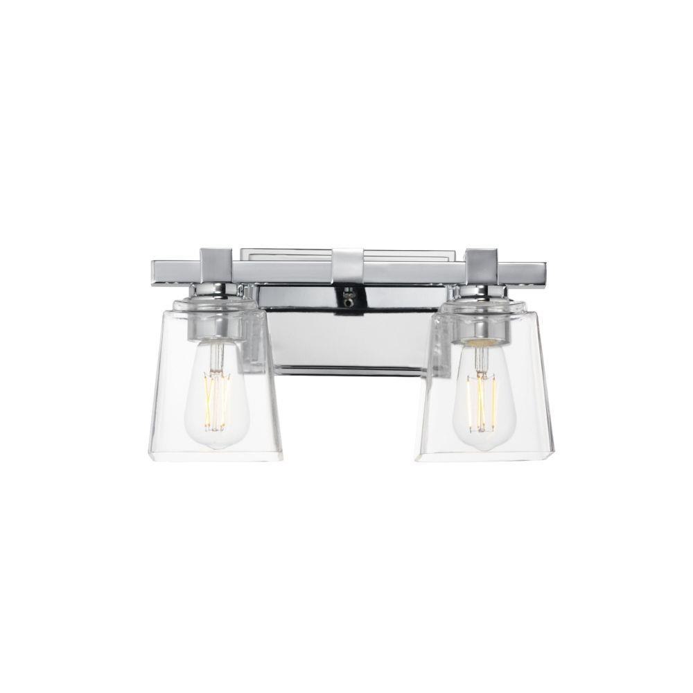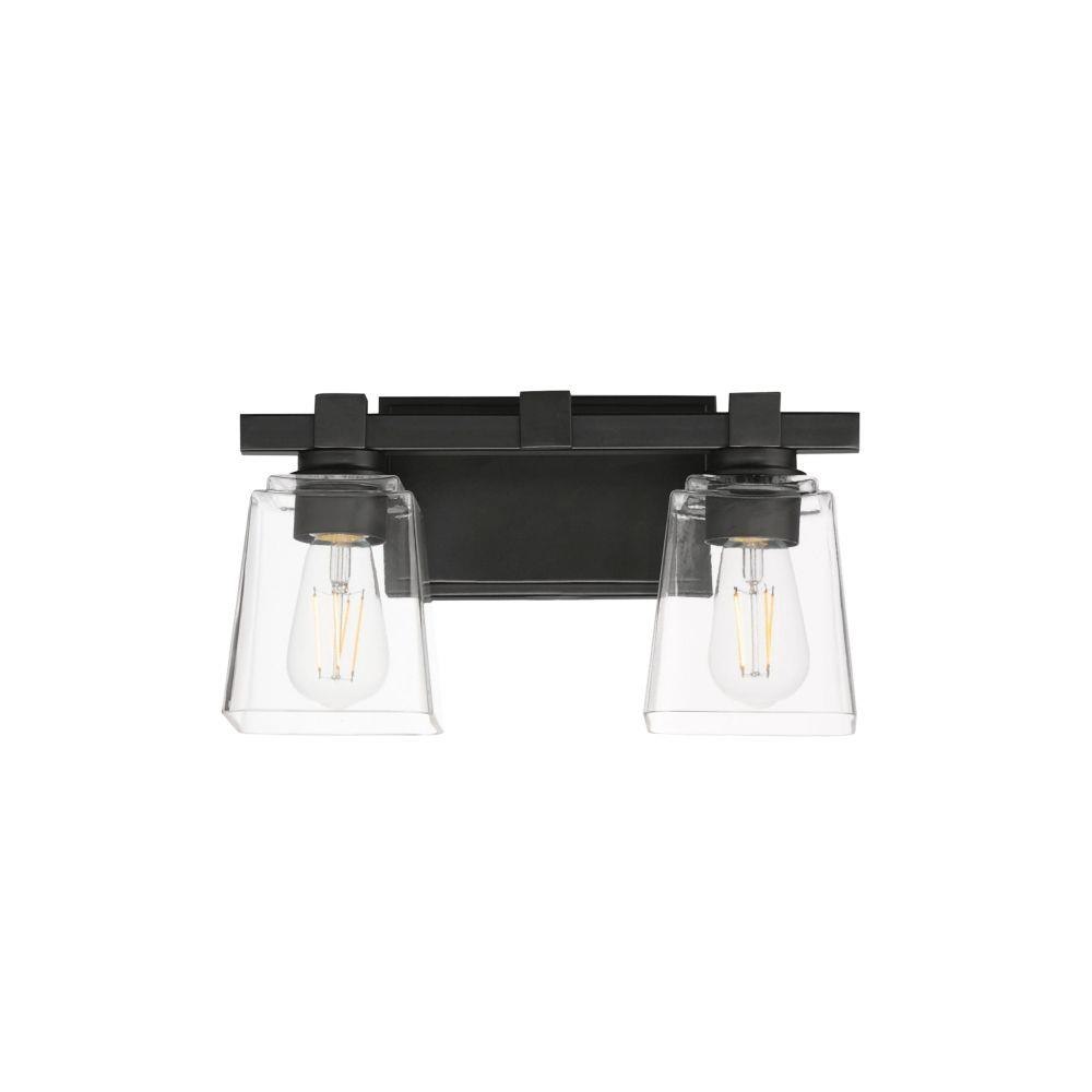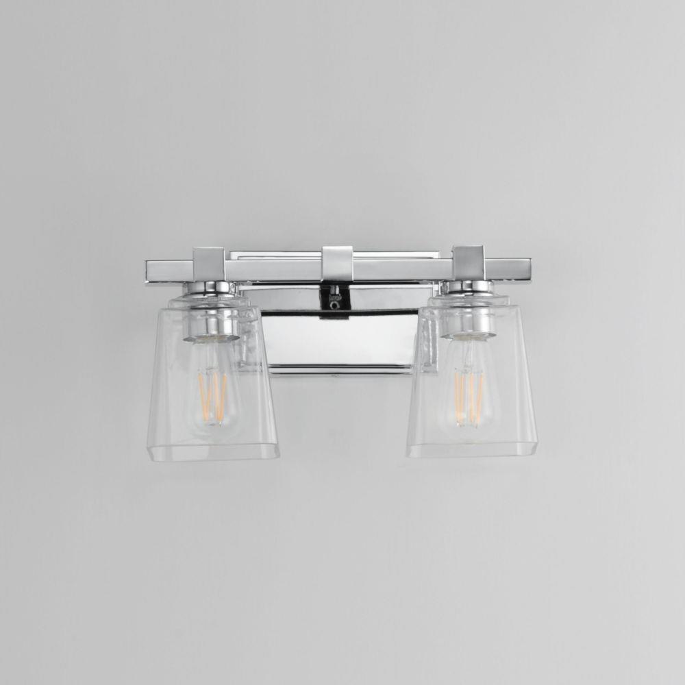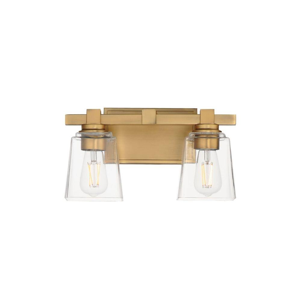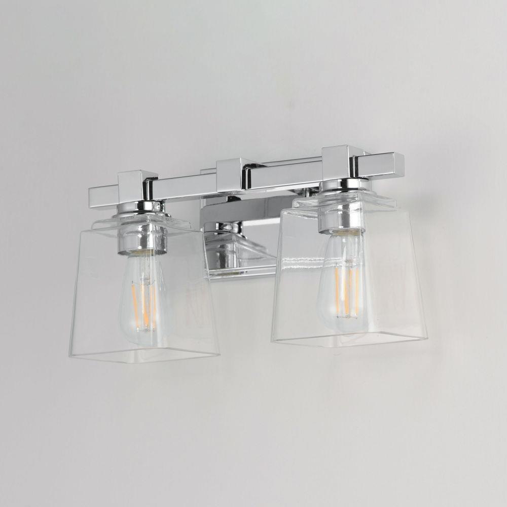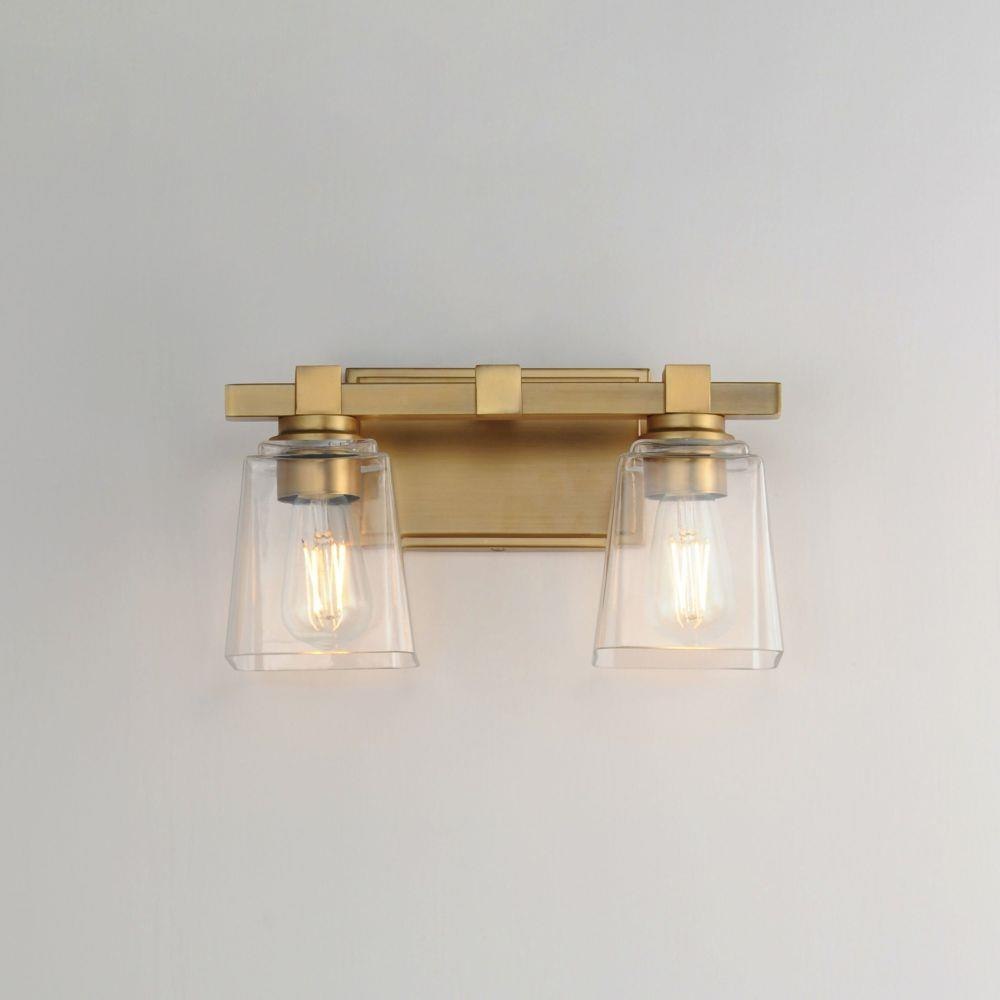 A composition of square forms that feature a Clear tapered square glass shade, these bath vanities provide a transitional design that suits both modern and traditional spaces. Available in Matte Black, Polished Chrome, and Natural Aged Brass.