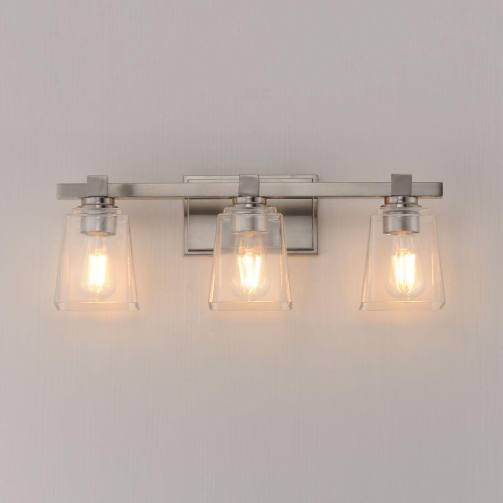 A composition of square forms that feature a Clear tapered square glass shade, these bath vanities provide a transitional design that suits both modern and traditional spaces. Available in Matte Black, Polished Chrome, Satin Nickel, and Natural Aged Brass.