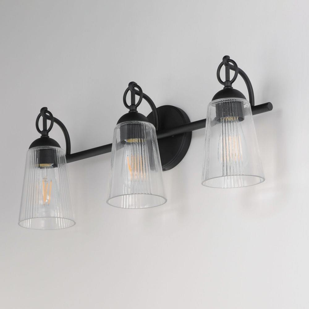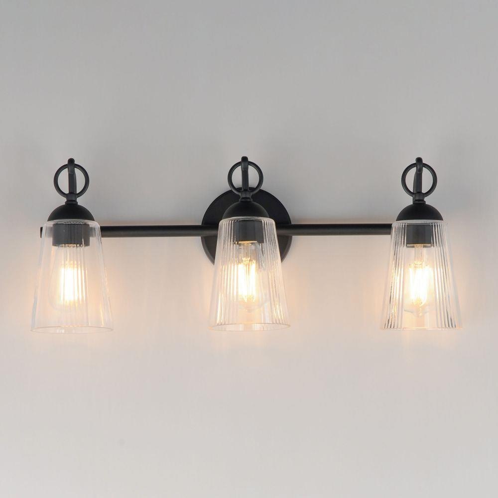 Inspired by the rugged charm of the American West, the Jackson Hole collection brings an elevated rustic sensibility to bath and vanity spaces. Tapered clear glass shades, subtly fluted with a vertical stripe detail, soften and refract light while reducing glare--adding a refined touch to their sculptural form. Each shade is anchored by a circular ring finial and gracefully suspended from an overhanging arm, evoking classic lantern motifs with a modern update. The result is a timeless design that bridges traditional character with relaxed, mountain-inspired style.