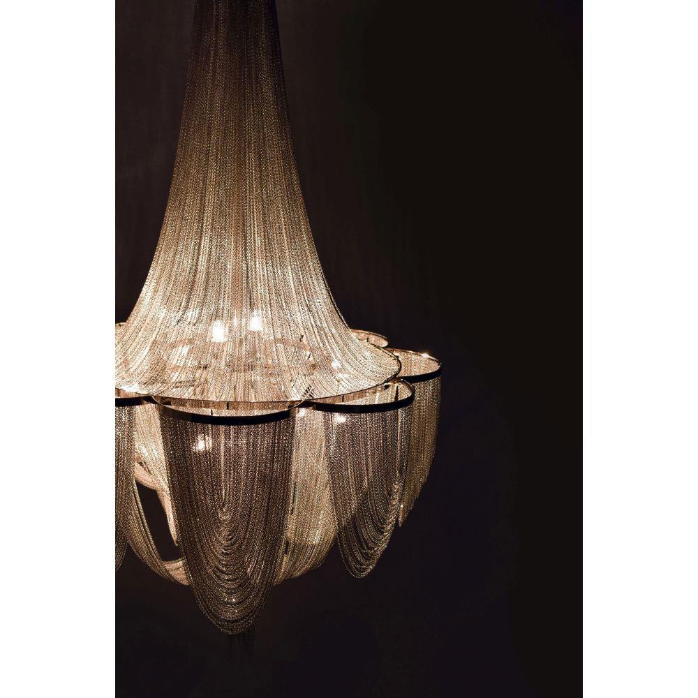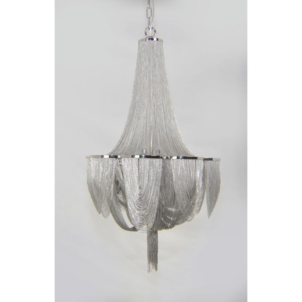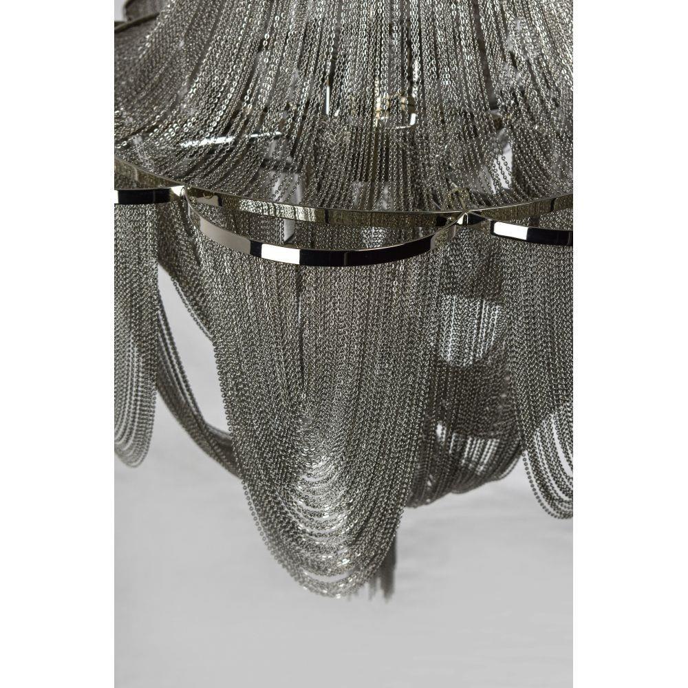 Chantilly collection features metal frames gracefully draped with Nickel finished jewelry chain. Metal trim rings of Polished Nickel add sharp contrast to the softness of the chain, which conceals the xenon light source.
