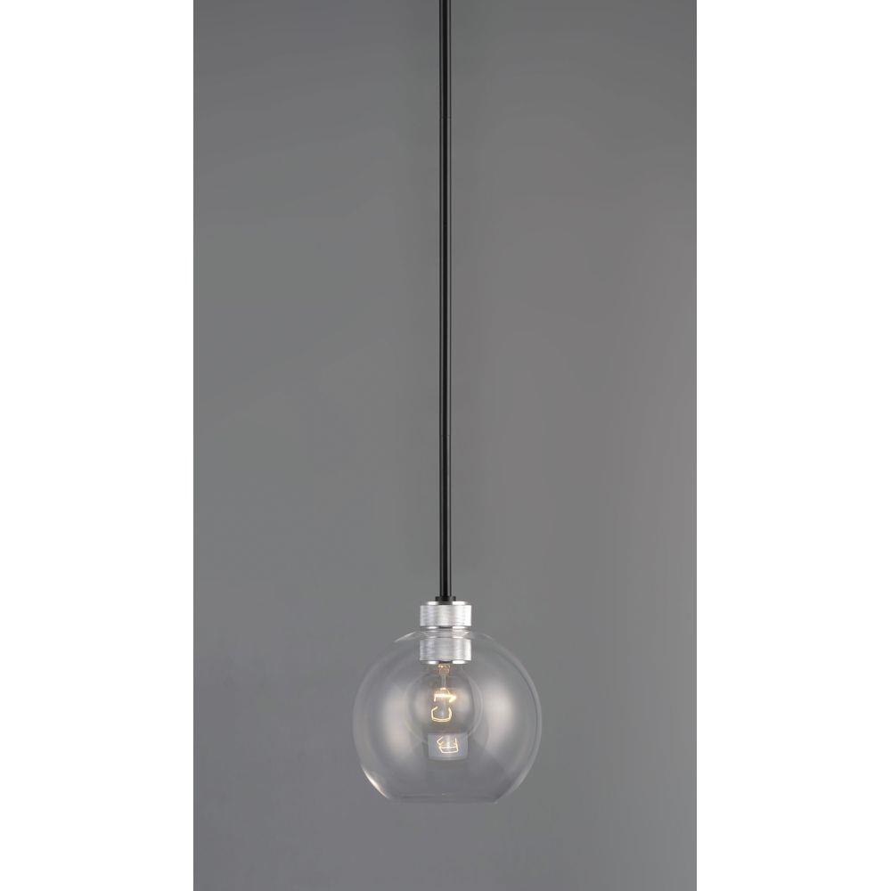 Machined and knurled sockets are finished in Brushed Aluminum which gives stark contrast to the Black round tube frames. Heavy weight Clear hand-blown glass spheres adds scale to this industrial classic.