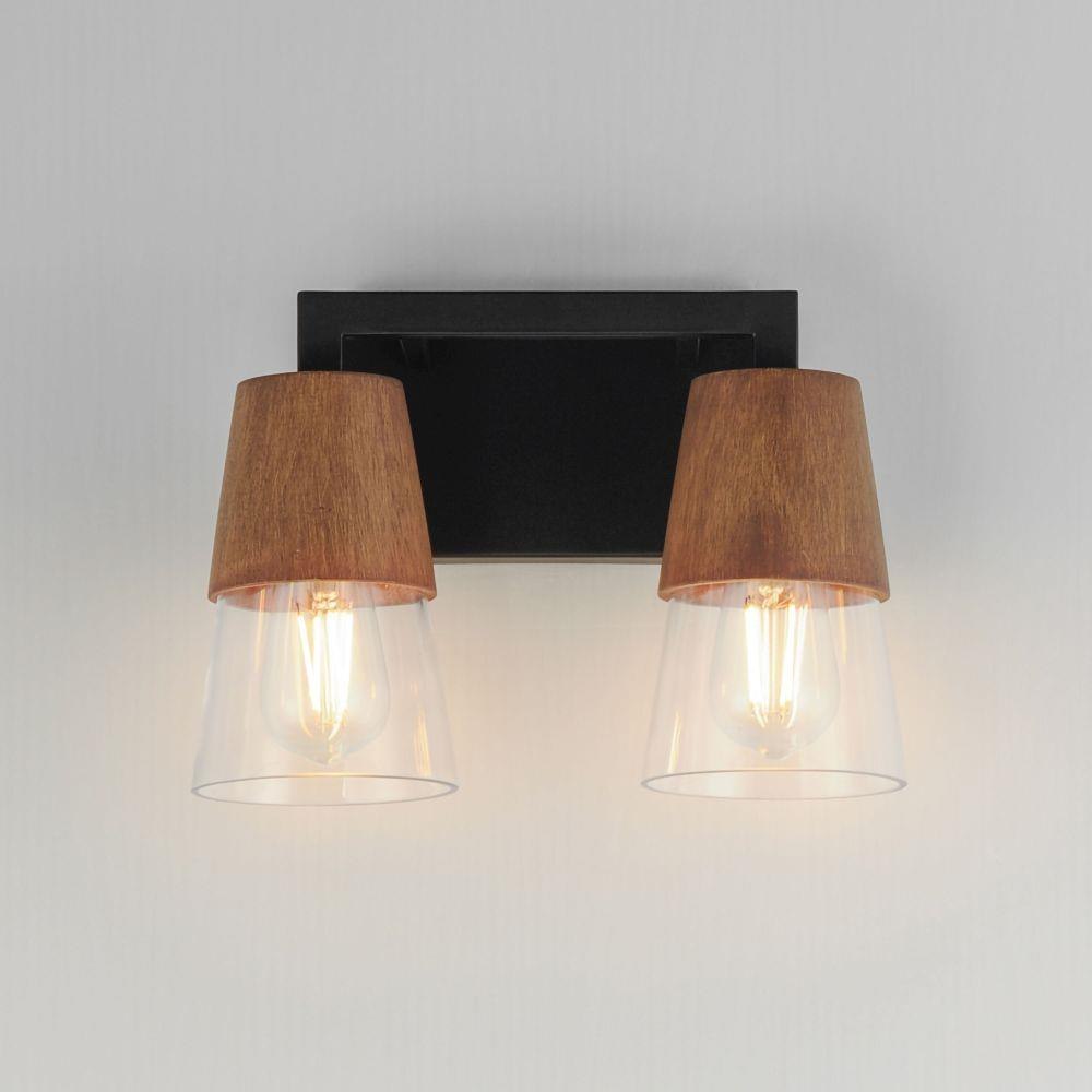 Capped by wood finished in Walnut, this series of bath vanity sconces feature conical Clear Glass shades. Contrasting Matte Black frames of squared tubing add clean geometry to the design. Use decorative lamps in the shades to complete the look.