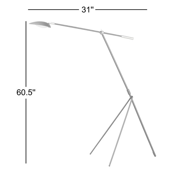 Retro flex. Built from aluminum in a black + satin brass finish, this dimmable floor lamp holds an integrated LED bulb in its shallow scooped shade. It leans forward engagingly in its tripod stand, and both the arm + shade are adjustable, so you can shine its light wherever you need it.