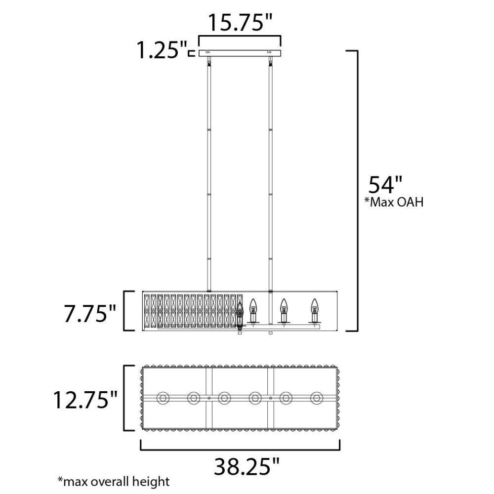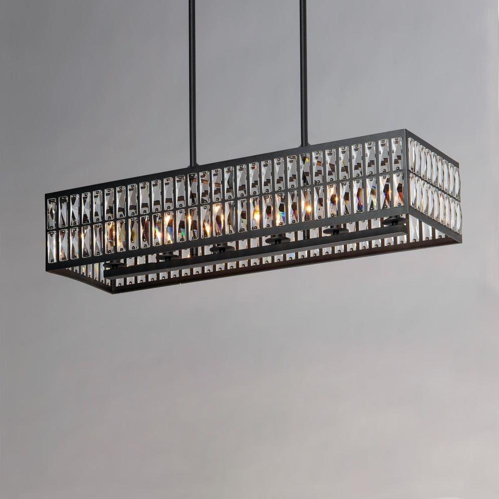 Rectilinear Beveled Crystals bejewel a Matte Black frame creates stark contrast to this radiantly prismatic display of light. The bound crystal is fixed to the frame to reduce time spent dressing the fixture.