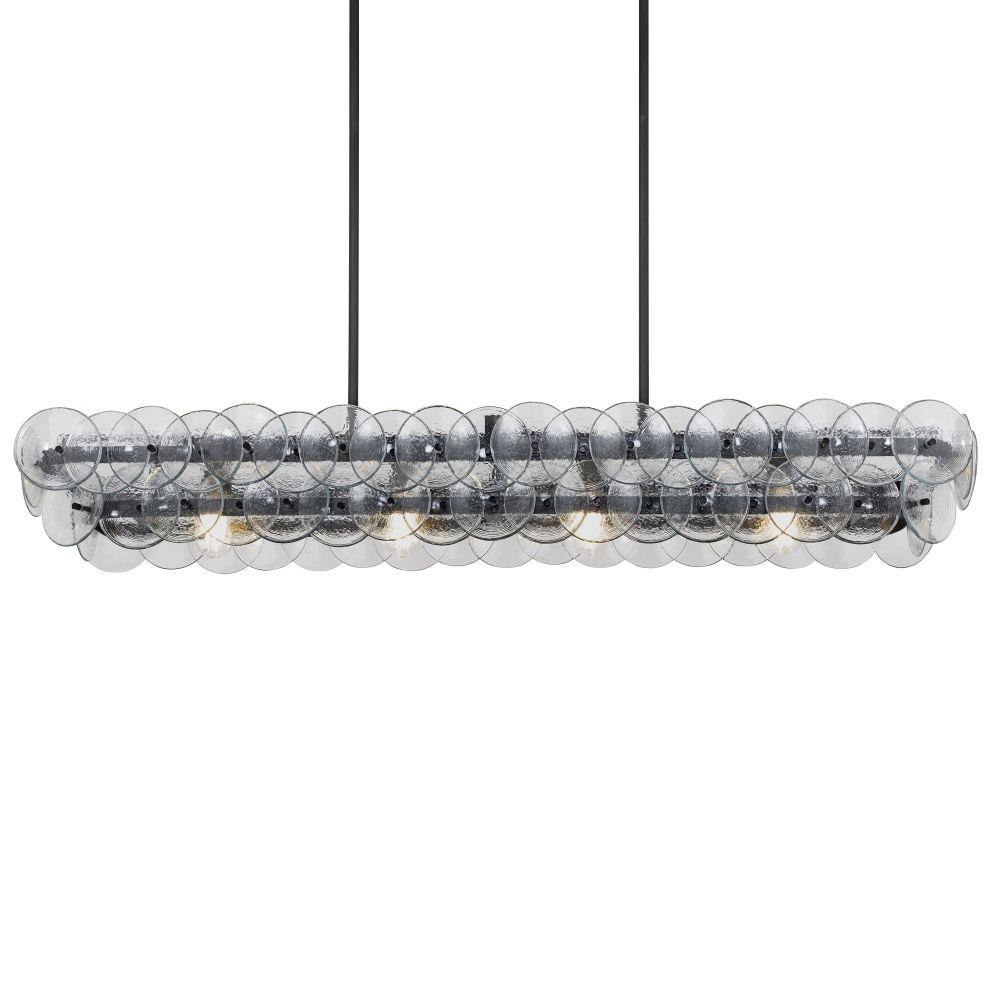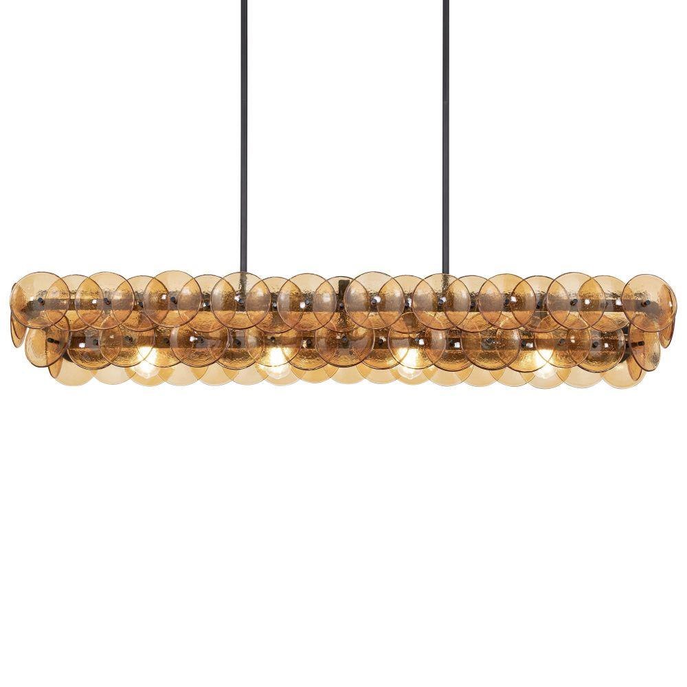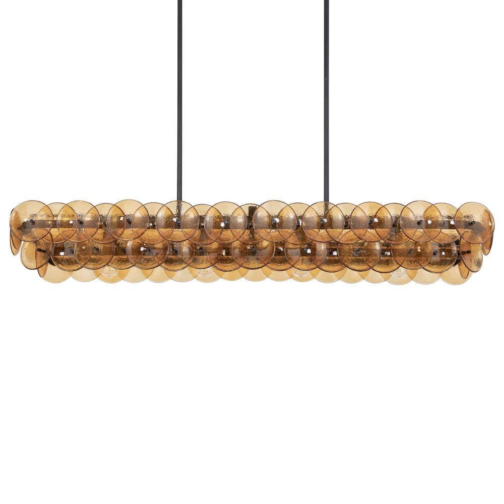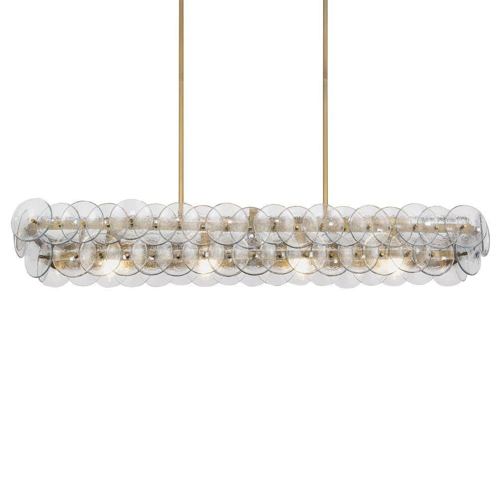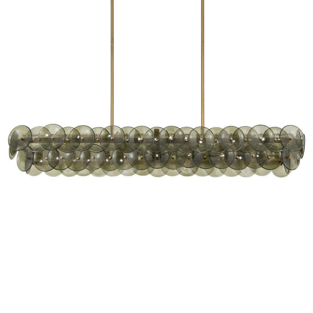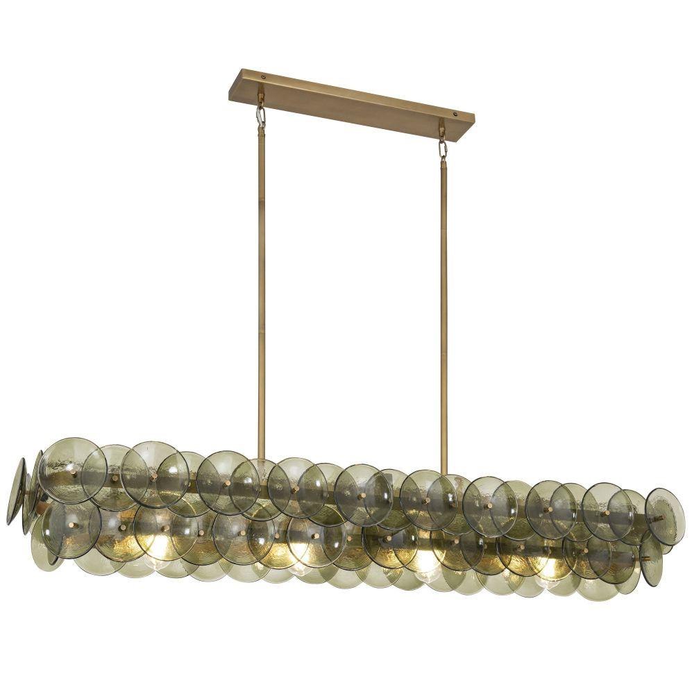 Overlapping handmade pressed glass disks are mounted on metal frames reminiscent to Mid-Century Italian design. Available in finish combinations of Textured Clear or Vintage Green glass on a Weathered Brass frame or Amber glass on a Gunmetal frame. The texture of the glass softens the glare of light bulbs creating a warmer glow that is enhanced with the use of colored glass options. Choose from round or linear configurations that are perfect for applications over a dining table or in living spaces.