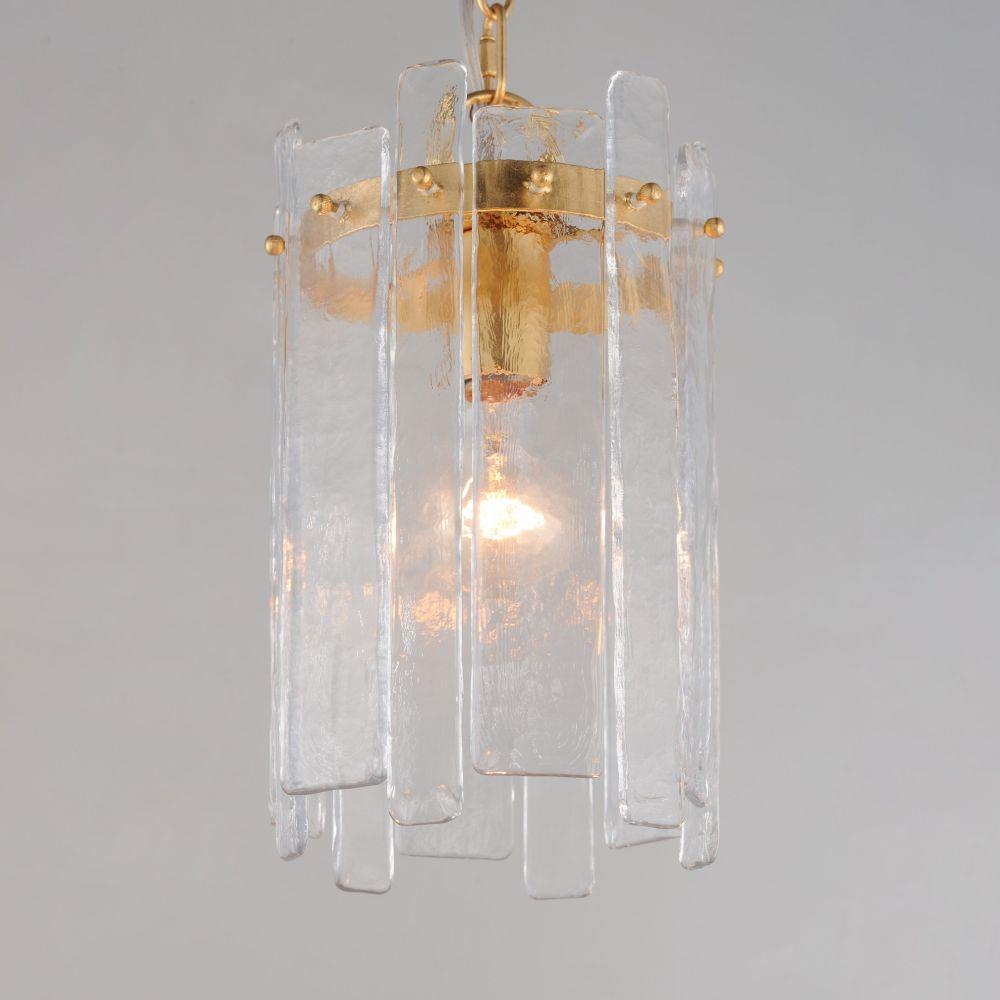 Gracefully flowing molten glass panels with a uniquely organic aesthetic encircle rings of rich Darkened Bronze metal or hand-applied Gold Leaf. This refined interpretation of tiered glass pendants exudes warmth and elegance, effortlessly blending a moody ambiance with timeless contemporary charm.