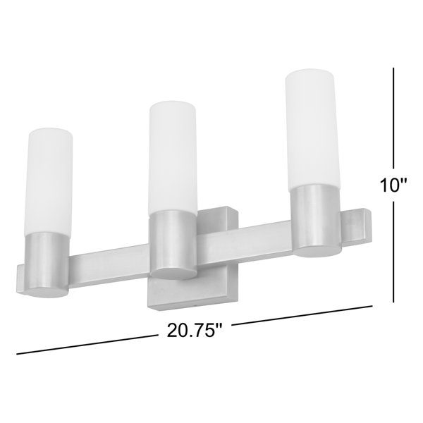 This vanity light takes a modern approach to a classic traditional style. The frame is made from metal with a rich aged brass finish and features a sleek support arm mounted on a square backplate. Three frosted cylindrical glass shades provide soft diffused light while adding a curated touch we love. Inside each shade, this hardwired vanity light accommodates three 40W candelabra-based bulbs. Best of all, it's endlessly versatile: It features reversible mounting, dimmer switch compatibility, and a damp location rating that's ideal for covered porches or steamy bathrooms.
