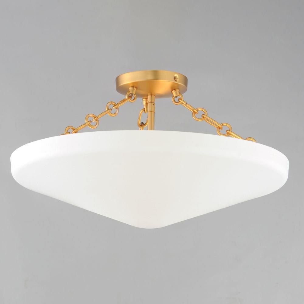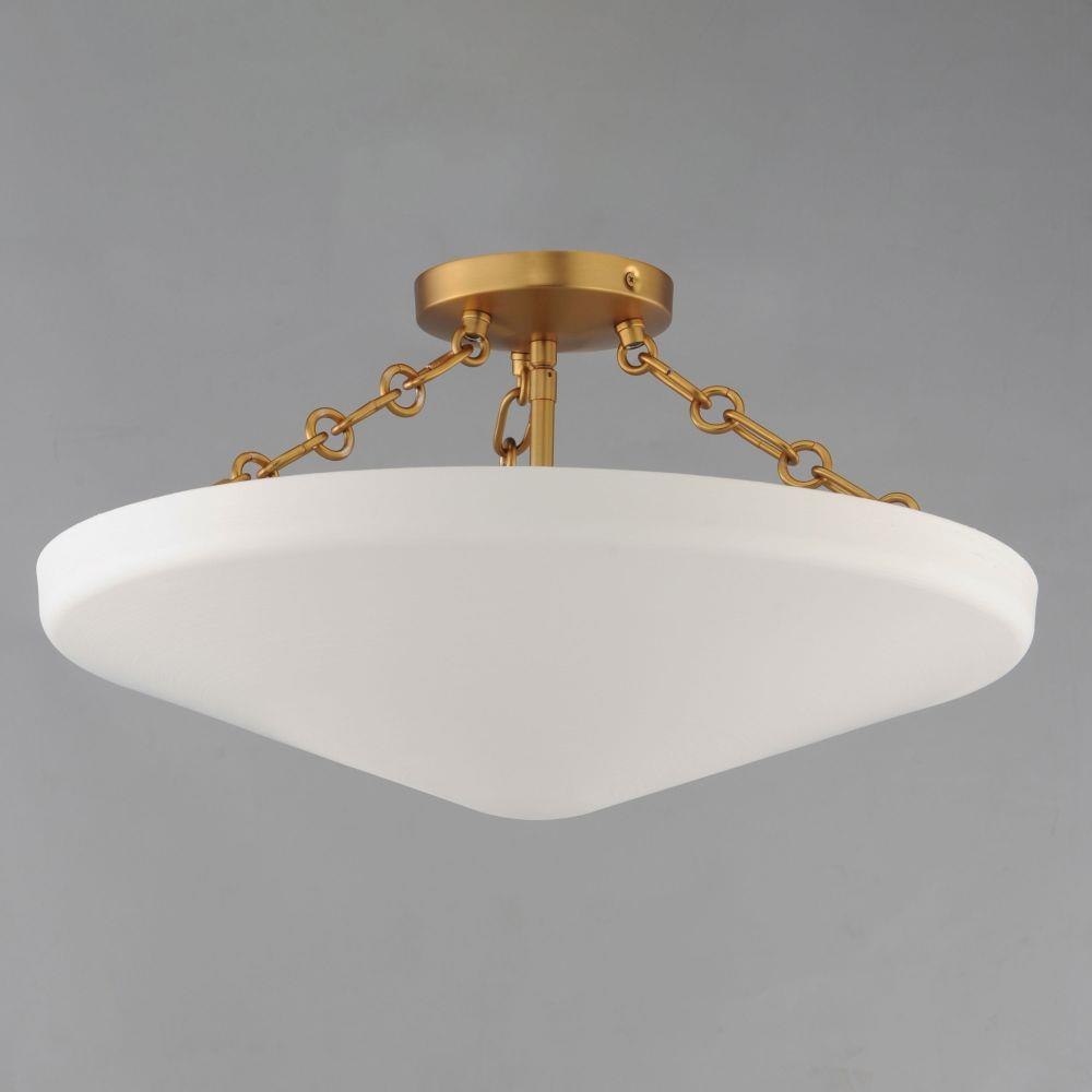 An inverted steel cone vessel painted in textured Plaster White gesso provides ambient lighting with classical styling. The stylized ring and oval chain links in Natural Aged Brass compliment the overall design. Available in two sizes of pendants and flush mount.