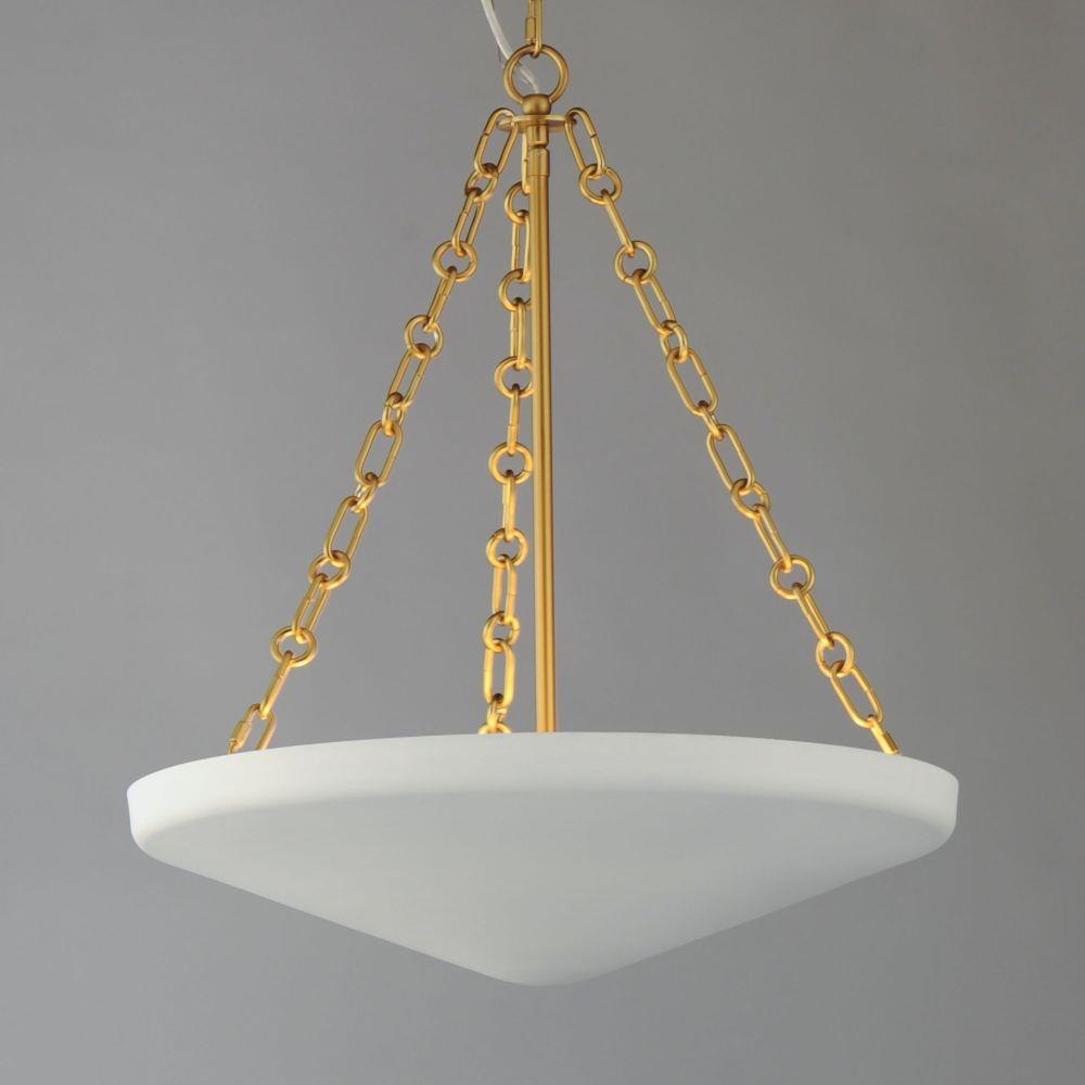 An inverted steel cone vessel painted in textured Plaster White gesso provides ambient lighting with classical styling. The stylized ring and oval chain links in Natural Aged Brass complement the design. Available in two sizes of pendants.
