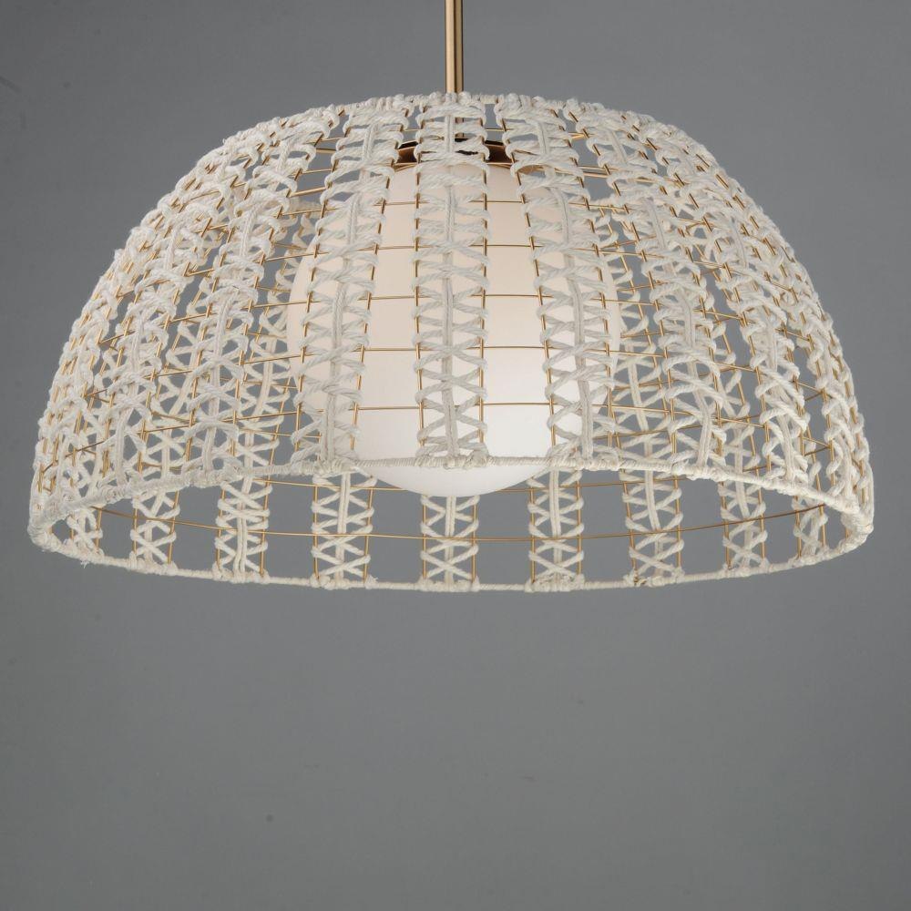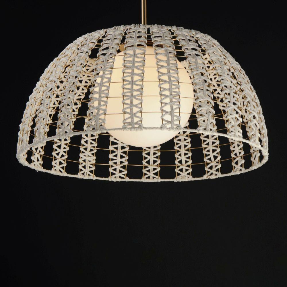 Varied cotton ropes in an Off-White finish are hand woven in a decorative pattern along a metal frame finished in Gold. Housed within these artisanal shades, Satin White glass globes softly diffuse enclosed lamps.
