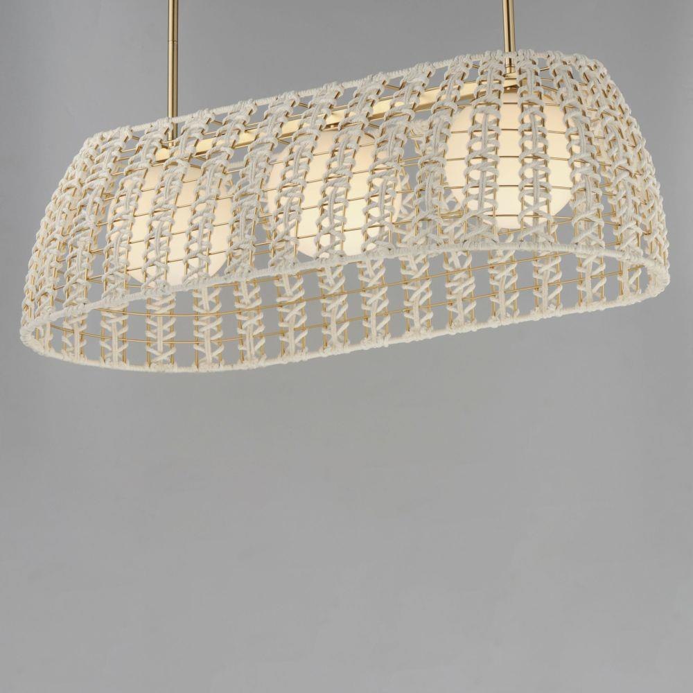 Varied cotton ropes in an Off-White finish are hand woven in a decorative pattern along a metal frame finished in Gold. Housed within these artisanal shades, Satin White glass globes softly diffuse enclosed lamps.