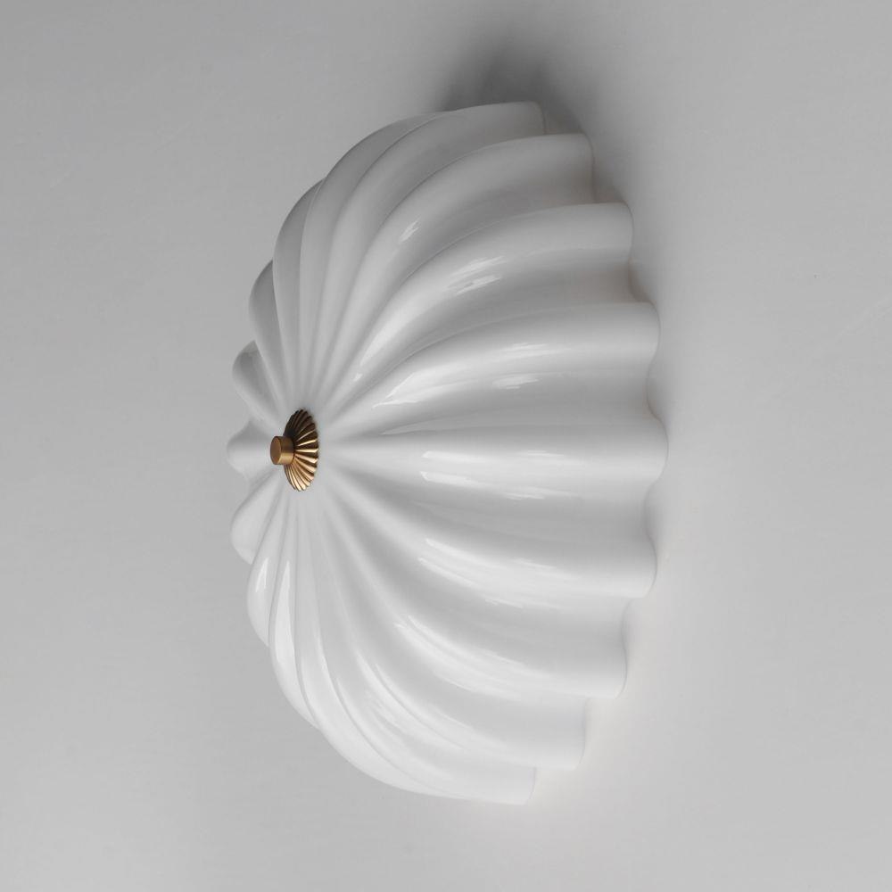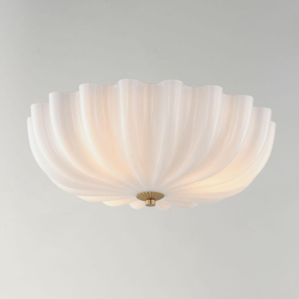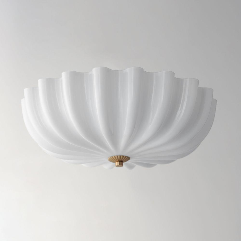 With glossy opal white glass shades, this collection brings a graceful, feminine touch to the inverted bowl design inspired by the shape of a bundt cake. Suspended by a decorative circular ring chain, the shade features an acrylic dust cover that encloses the top, keeping the glass pristine. Finished in Natural Aged Brass, the chain and metalwork complement the timeless elegance of the design, while ribbed glass accents add a distinctive, sophisticated detail to the design.