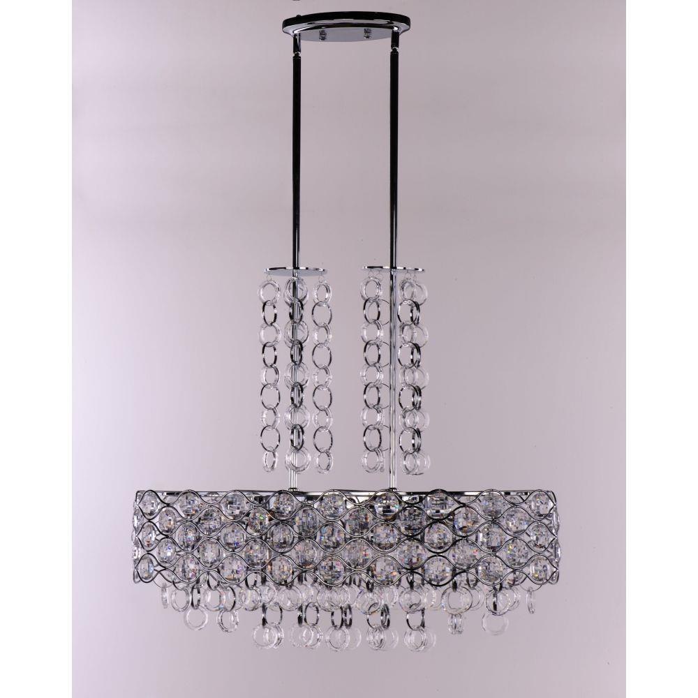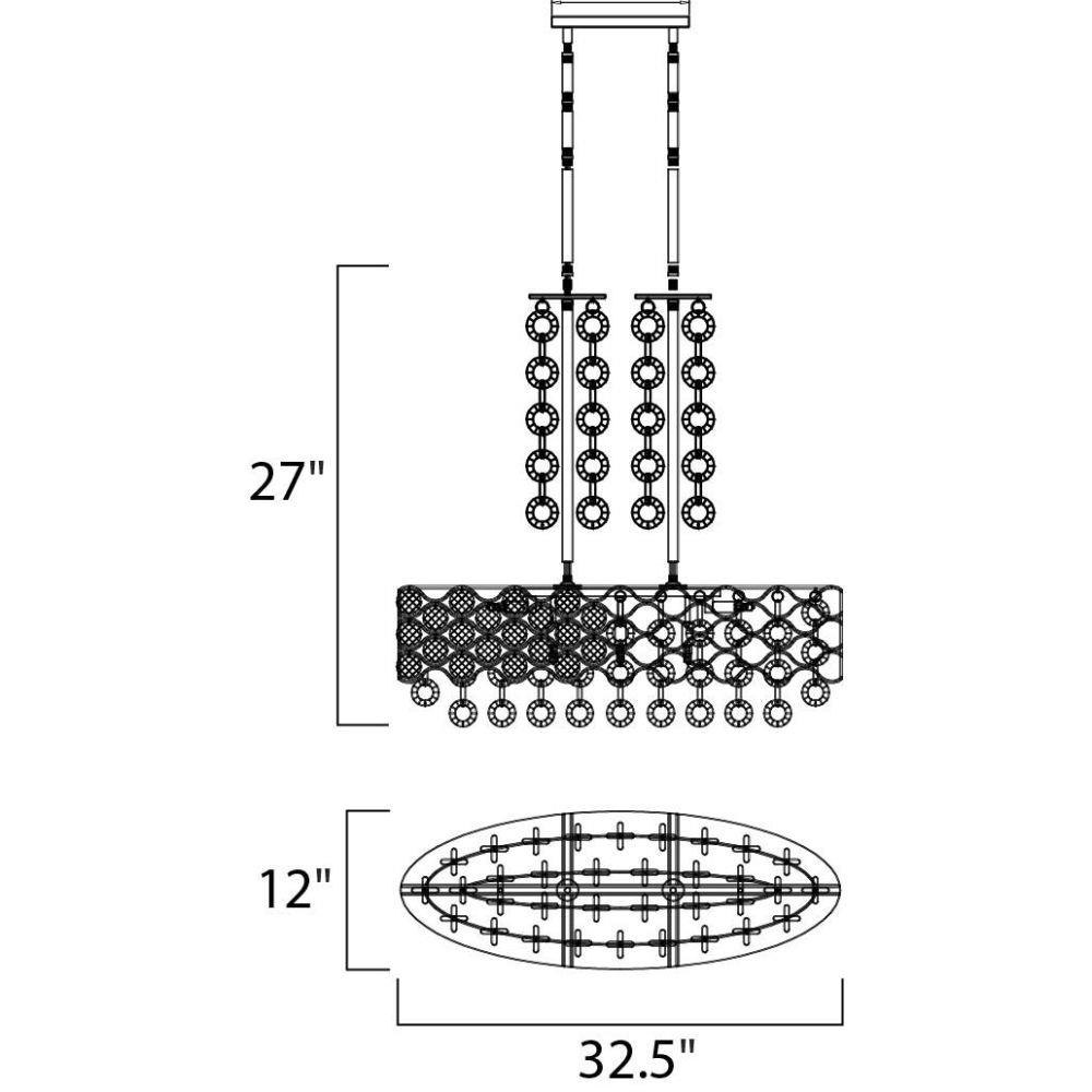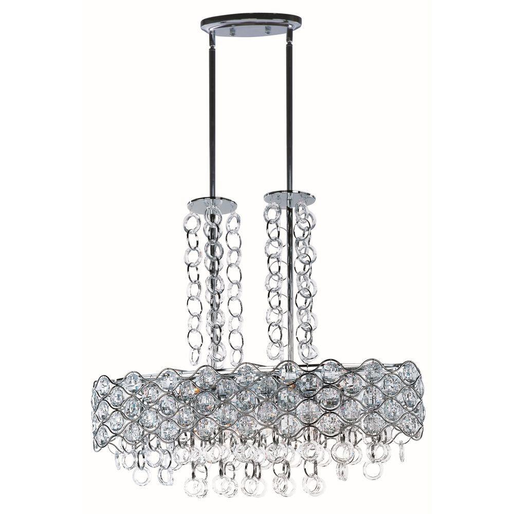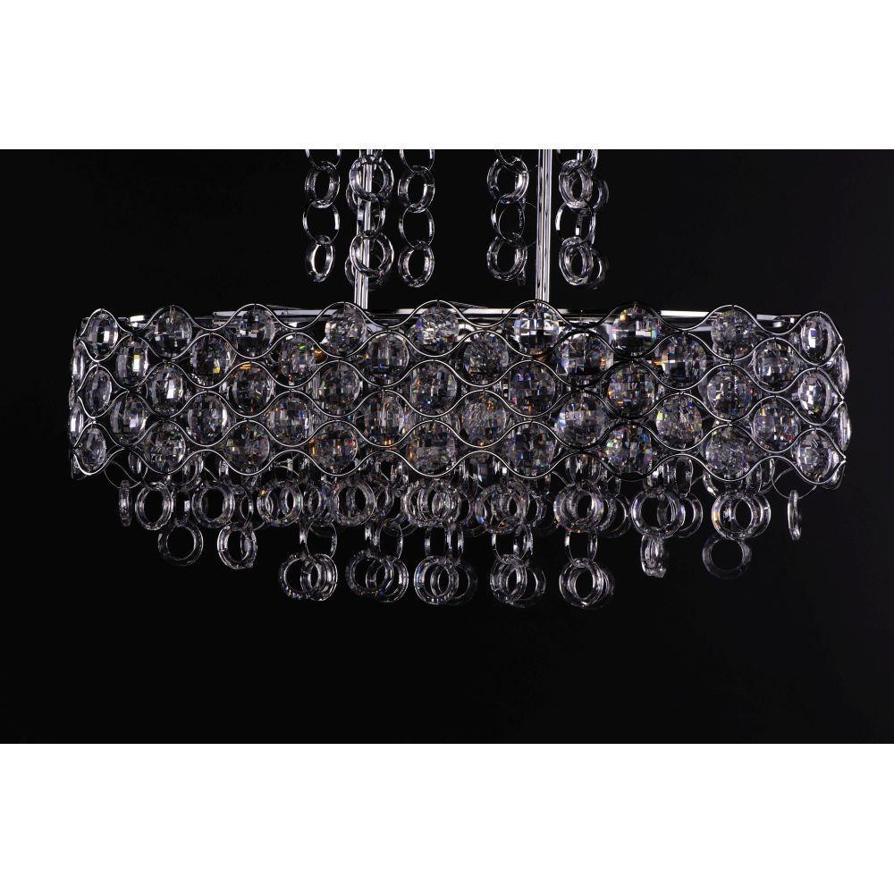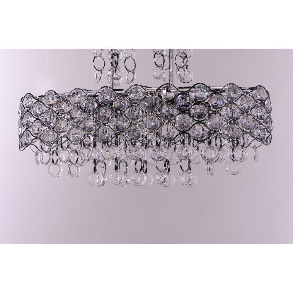 Chains of faceted crystal rings are linked together by Polished Chrome jewelry bands that cascade from the top and through the fixture. The exterior shade of wave-like metal encases multi-faceted Beveled Crystal jewels, which sparkle from the light of the Xenon lamps.