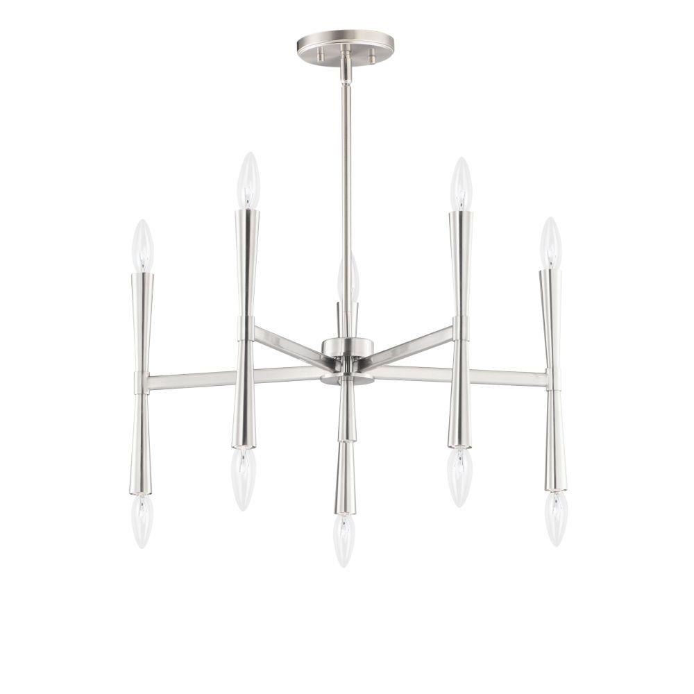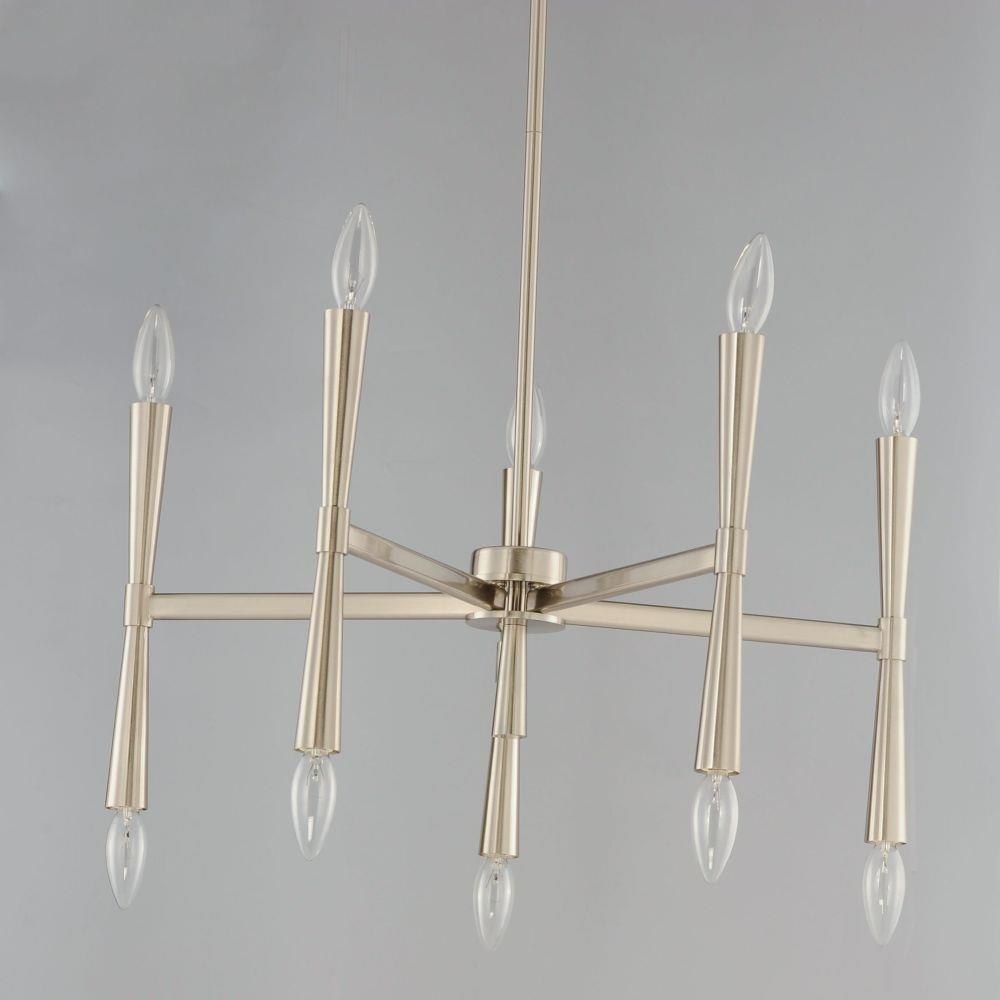 Civic styling using straight rectilinear channels radiating from a central connector. The light sources flare out both up and down with tapered candle covers creating a form evocative of a classic torch. Available in matte Black, Satin Brass, and Satin Nickel, this is a transitional look suited to a variety of architectural stylings.