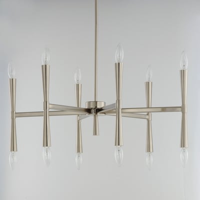 Maxim Lighting Rome Chandelier in Satin Nickel finish, 29.3" wide, featuring a sleek, modern design with multiple curved arms and elegant bulb fixtures.