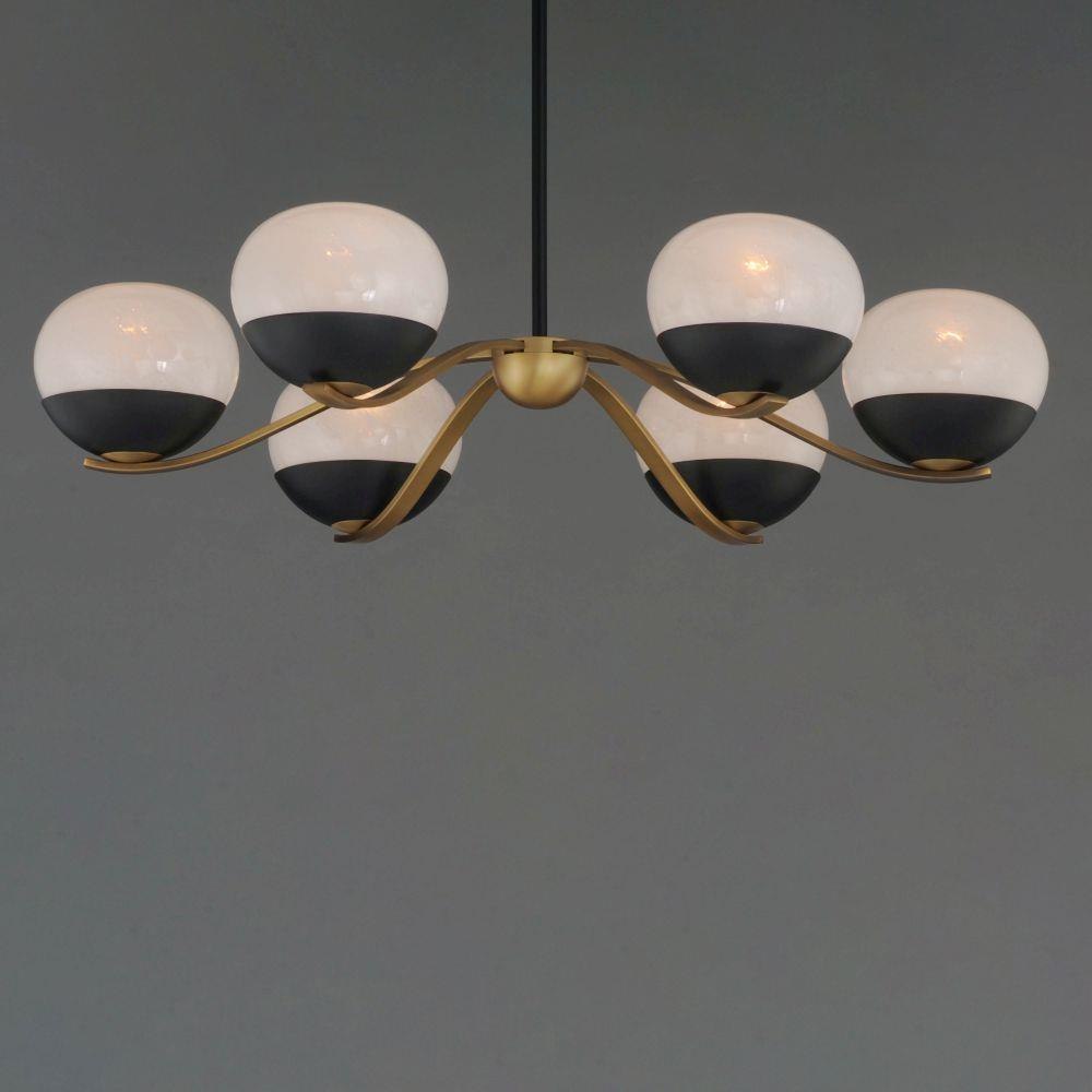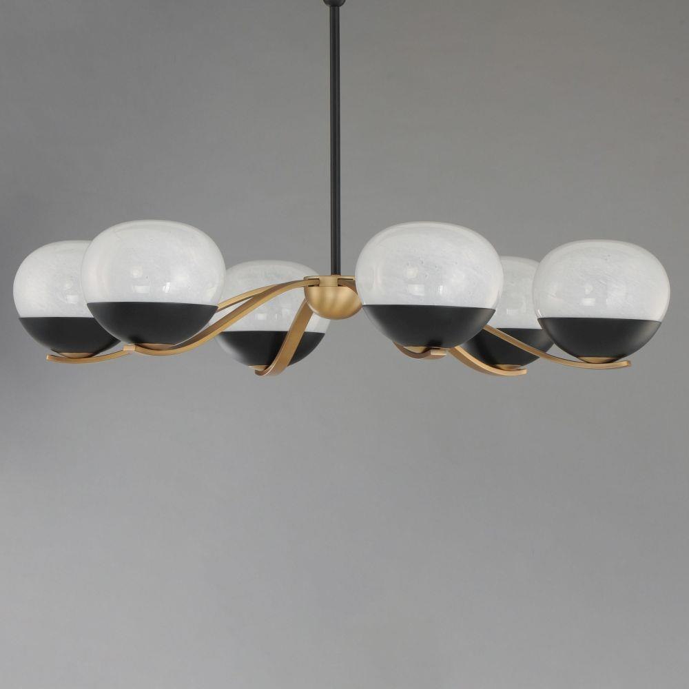 Notably stylish and unique, the Lucerne collection features oblong glossy glass globes with a swirling Marble pattern that exudes sophistication. The distinctive rectangular arms gracefully curve downward, seamlessly blending robust metal fabrication with precision and fluid elegance. Contrasting Black and Natural Aged Brass finishes accentuate the bobeches, adding depth and visual intrigue. Offering versatile installation options, the chandelier can be suspended by a sleek stem or the chain included for various height adjustment.