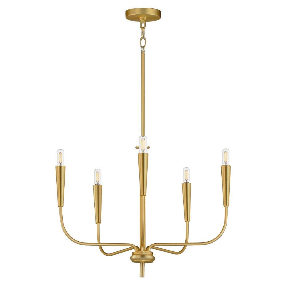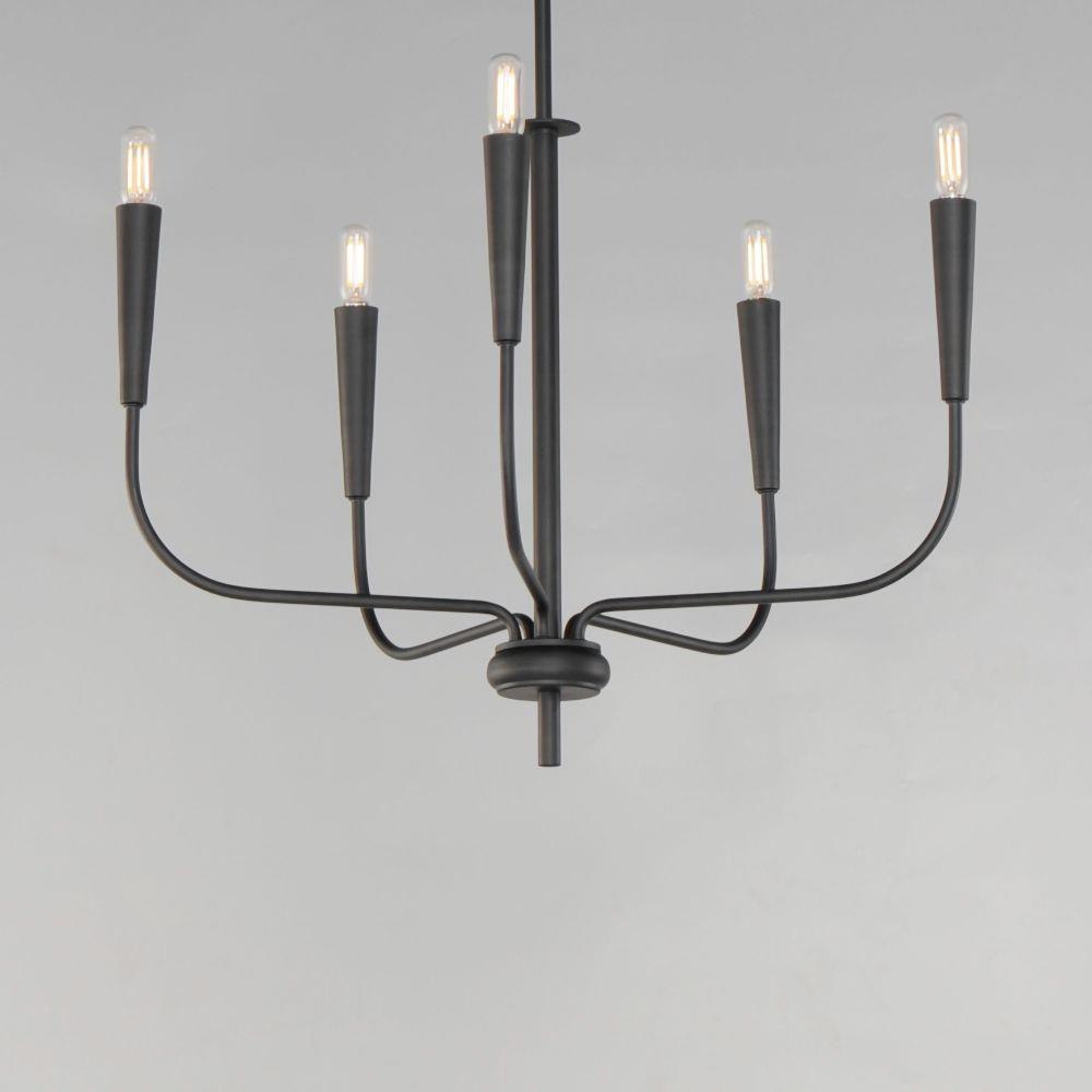 A simple candle style chandelier is given a modern edge with tall tapered candle covers that sit at the ends of curved arms without a bobeche beneath them. Available in Satin Brass or Matte Black, the collection compliments many architectural interiors and allows for creative styling through the selection of lamp type. Pair with our T6 lamp for more modern, industrial flair or classic candelabra for a clean, transitional look. This series provides a convenient new take on the candle chandelier with subtle and unique design details.