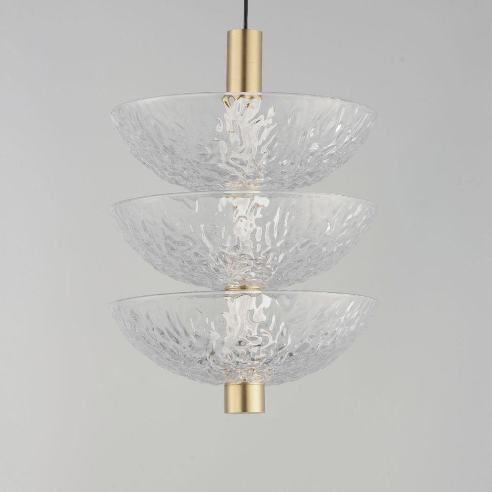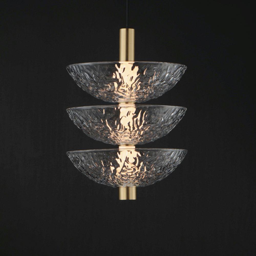 A modern take on the classic torchiere, the bright Satin Brass frames support thick textured glass cauldrons illuminated with dedicated LED modules. The 2-Light pendant and swing arm pin-up sconce feature rotatable shades directing the light either upward or cast directionally downward. The deep pattern in the glass sparks curiosity and fascination with its organic and abstract surface. It creates interest in the LED light source behind it while casting even light through the artistic vessels' design. Available in various configurations of pendants and sconces, the collection celebrates classic design concepts in an understated contemporary glamor that results in a composition suited to transitional and contemporary aesthetics. Make a statement with the oversized with the 3-light sconce nearly five foot in height or use the multiple functional pieces for reading our over an island.