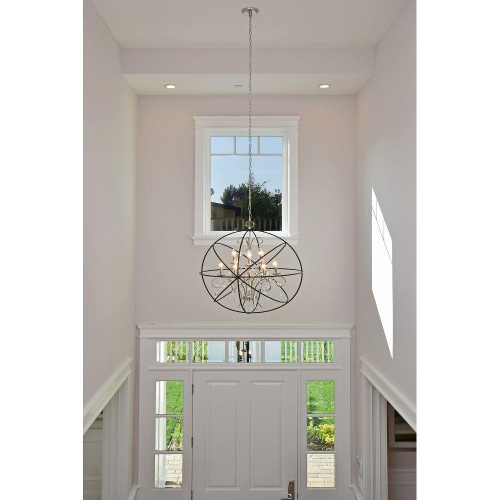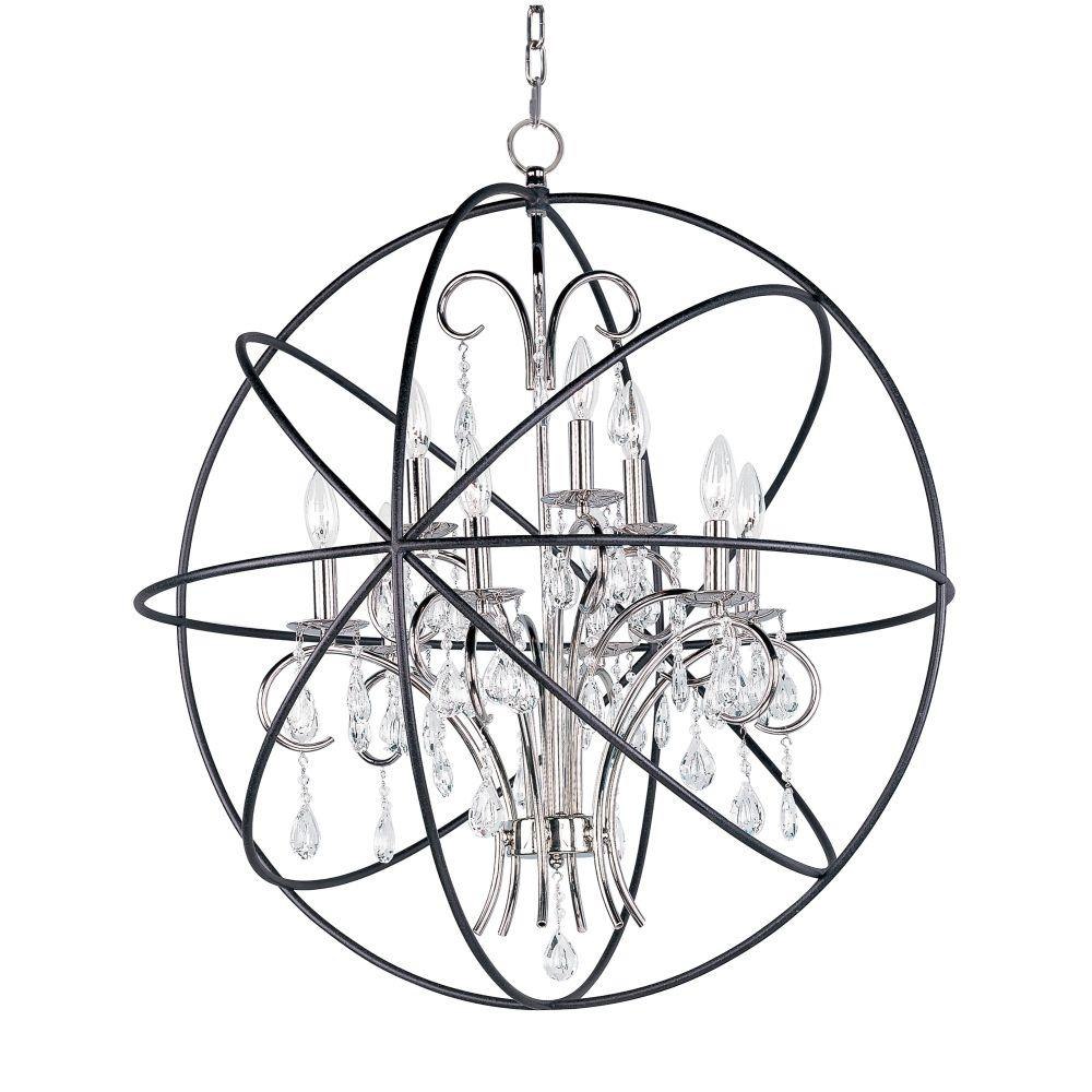 A spherical frame of metal surround a simple line chandelier draped in crystal for a transitional style that fits any interior design. Orbit is available in 2 sizes and 2 finishes, Oil Rubbed Bronze with Cognac crystal and a combo finish of Anthracite and Polished Nickel with Clear crystal.