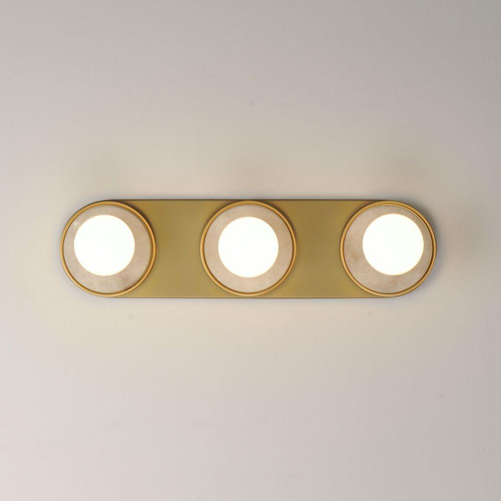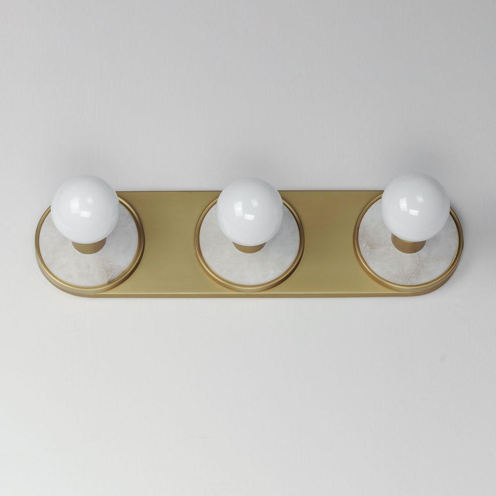 Get ready for your closeup. This collection of streamlined vanity lights are available in glamorous two tone finishes. Select from Natural Aged Brass with Matte Black or Spanish Alabaster plates. Globes of LED G25 lamps are included with the fixture.