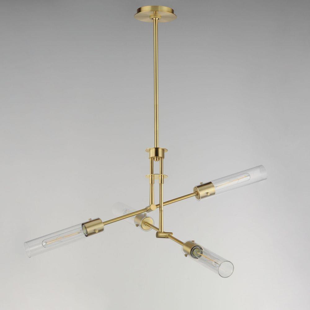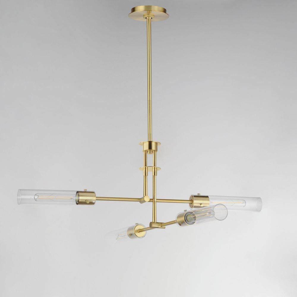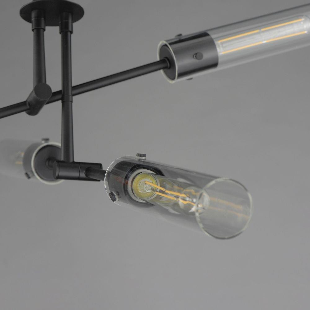 Dramatically modern, individually supported rods run through a series of flat circular disks adding interest to the elongated adjustable arms that can be configured according to how you choose to position them. Finished in Naturally Aged Brass and Matte Black finishes, the frames terminate at their ends with LED tubular lamps supplied and shrouded in long cylindrical glass shades secured with pins at the fixture's sockets. The characteristic details and warm filament light source add industrial flair making the collection's modern configuration suitable to a wider array of transitional styling.