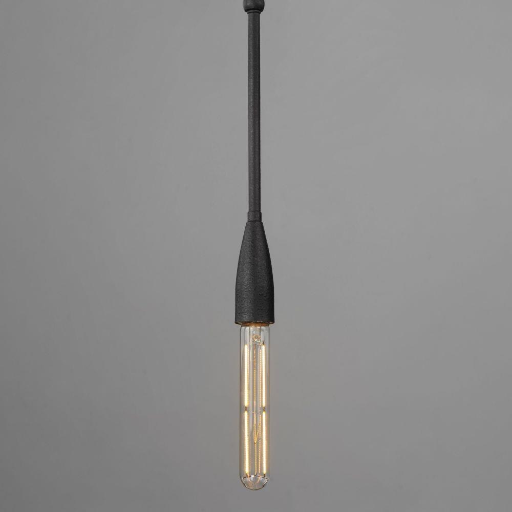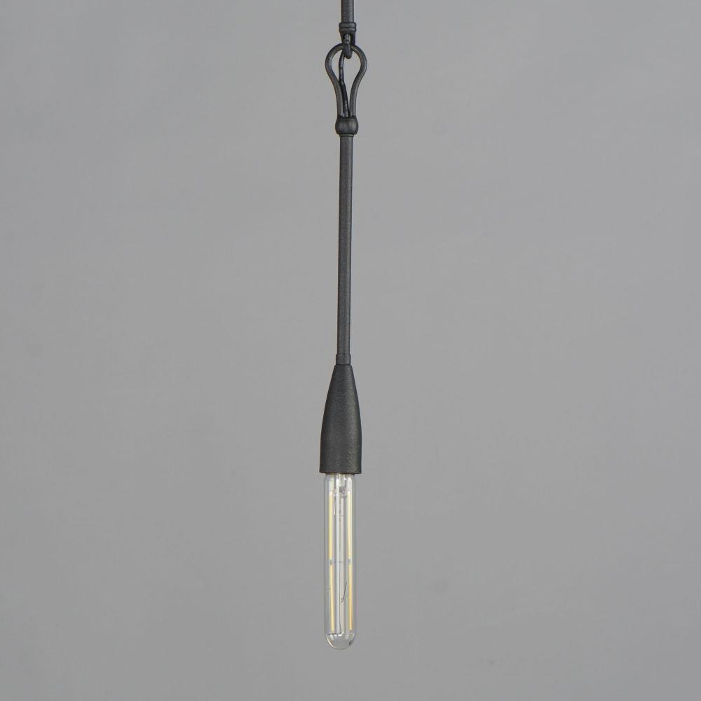 Simple and rustic, elongated metal rods are tiered with forged iron hook and loop details and in multiple configurations. The fixtures are finished in a textured Anthracite finish that adds to the forged iron craftsmanship. Available in multi-pendant configurations as well as a single pendant and sconce. Use tubular filament lamps to accentuate the verticality of the design.