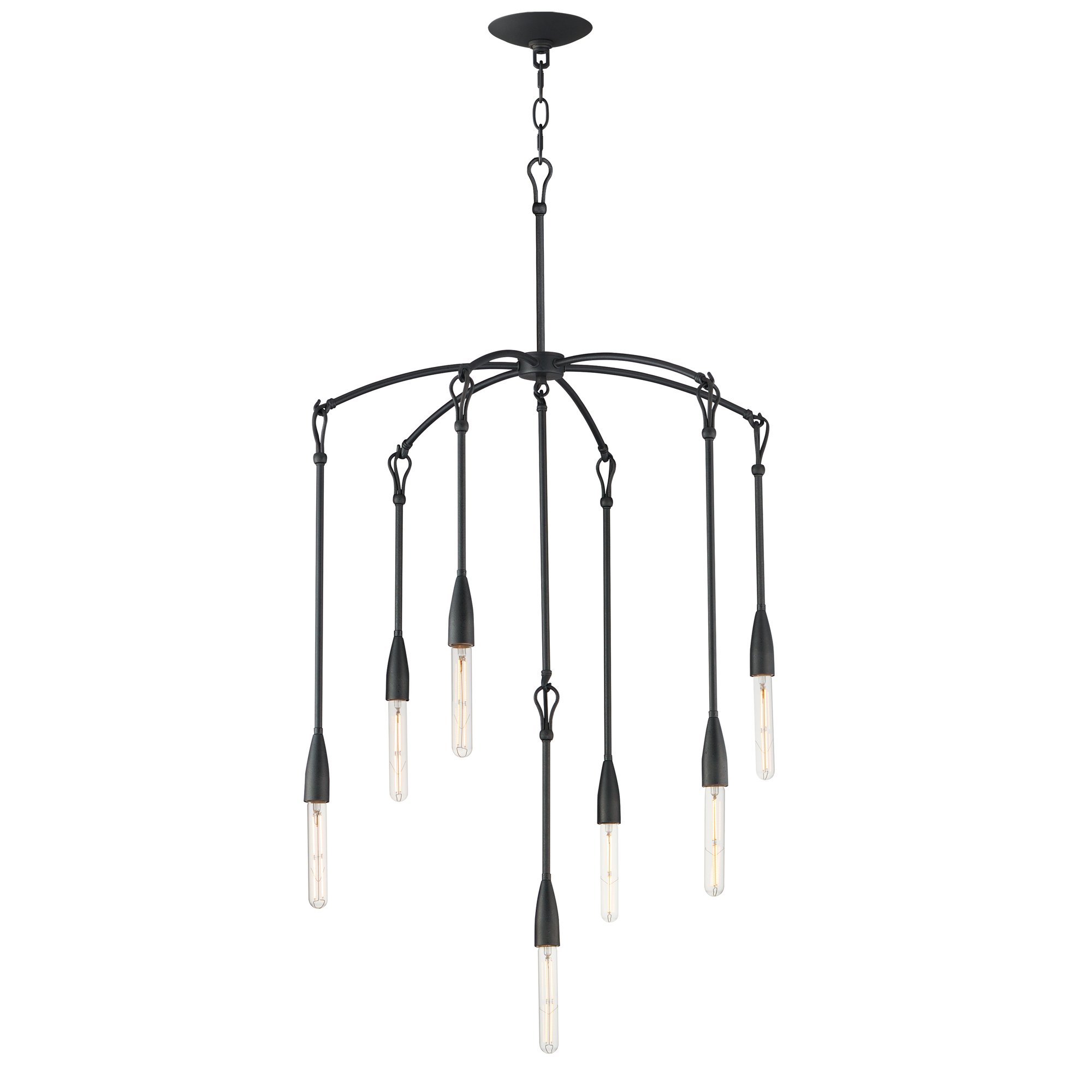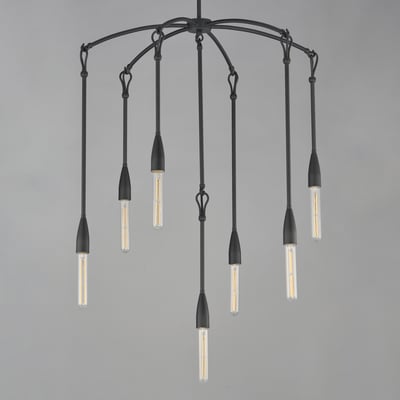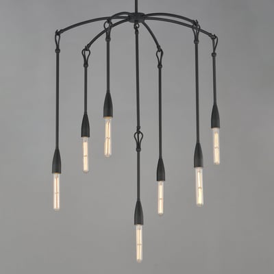 The Pioneer Chandelier enhances any space with its rustic charm and modern design. Featuring elongated rods and a forged iron hook, this fixture showcases a textured Anthracite finish that highlights its craftsmanship. Ideal for creating a striking focal point in various settings.