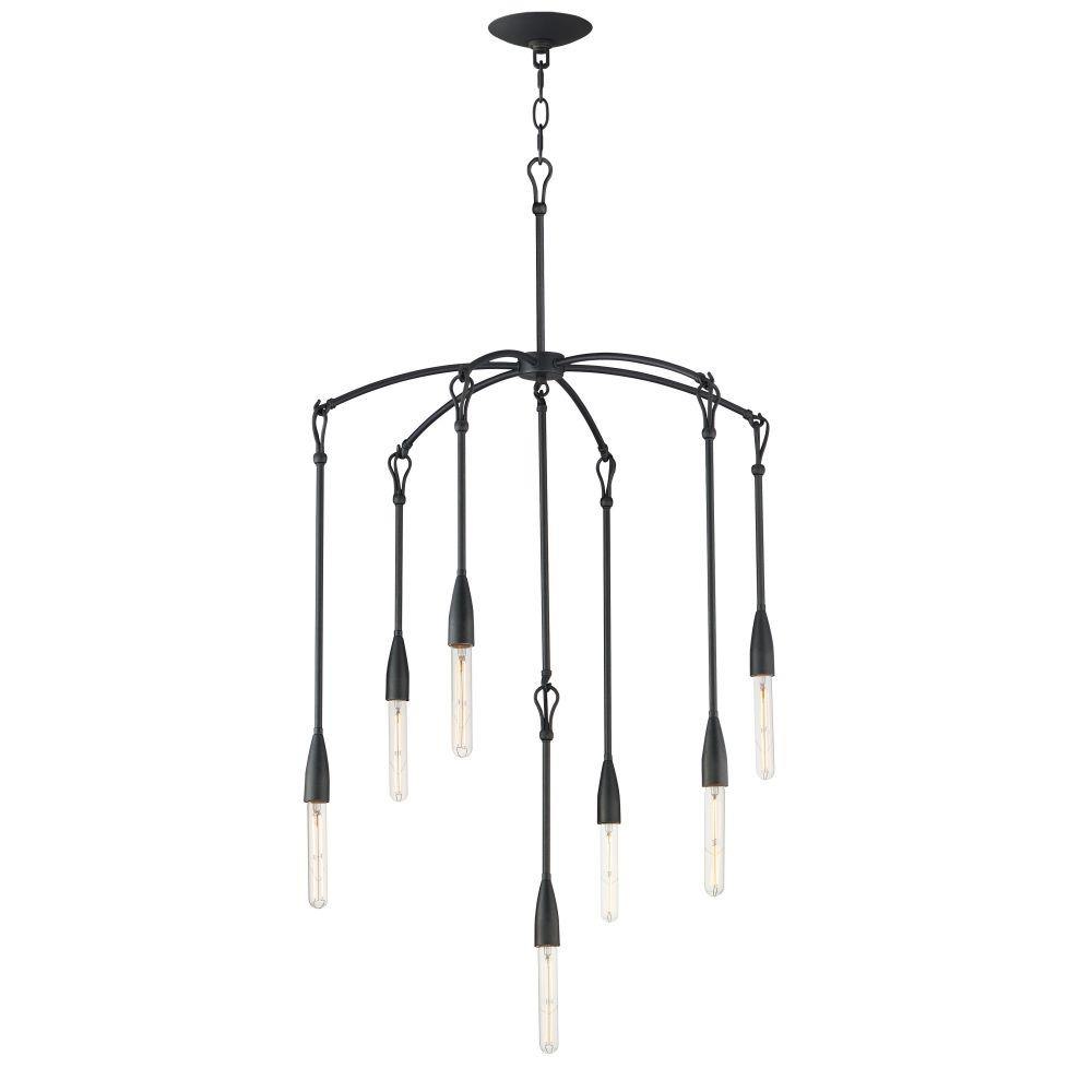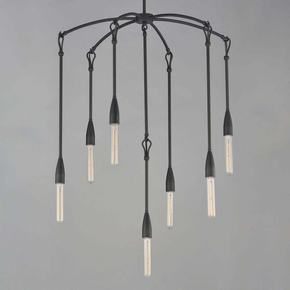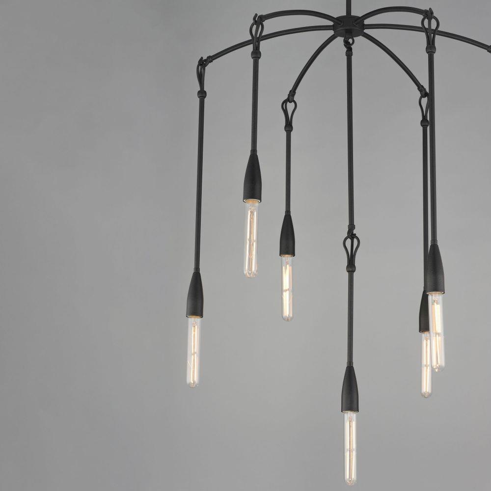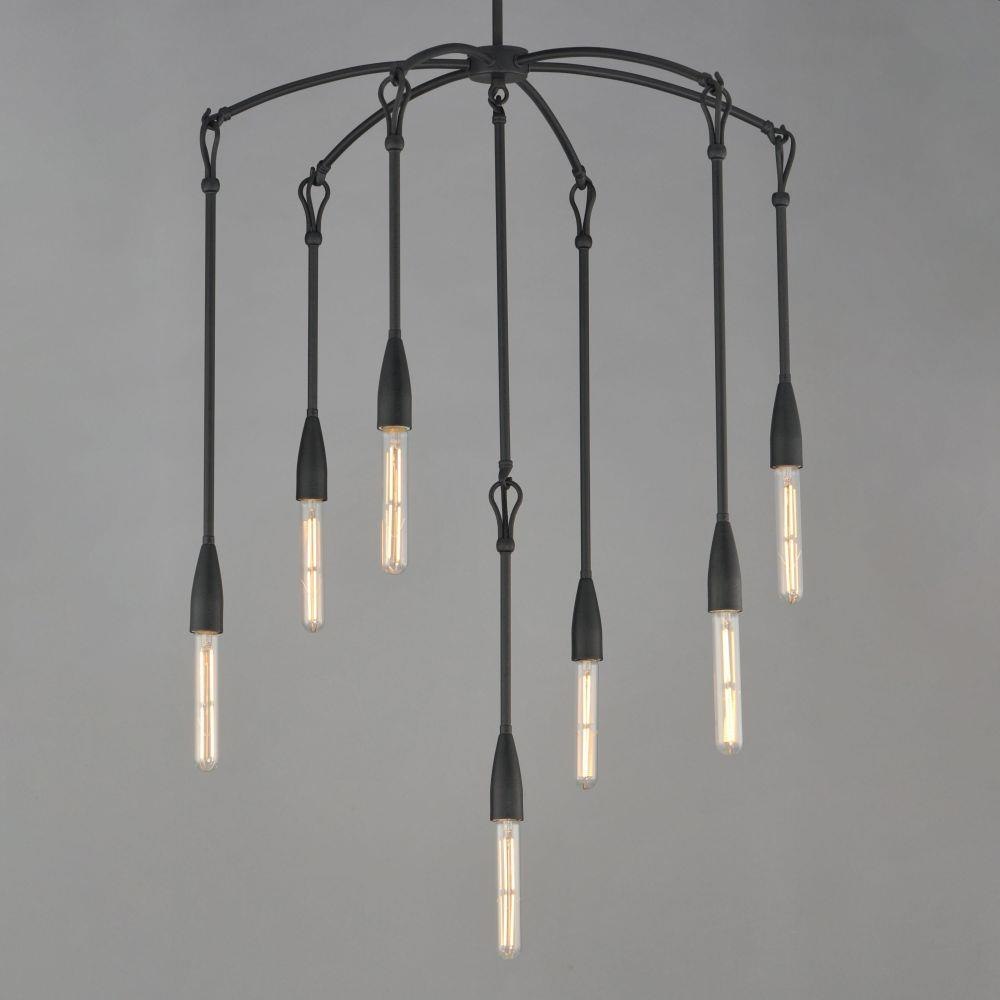 Simple with rustic elements, elongated rods are tiered with a forged iron hook and loop detail in multiple configurations. The fixtures' textured Anthracite finish enhances the artistry of the forged iron construction. Available in multi-pendant configurations as well as a single pendant and sconce. Use tubular filament lamps to accentuate the verticality of the design.