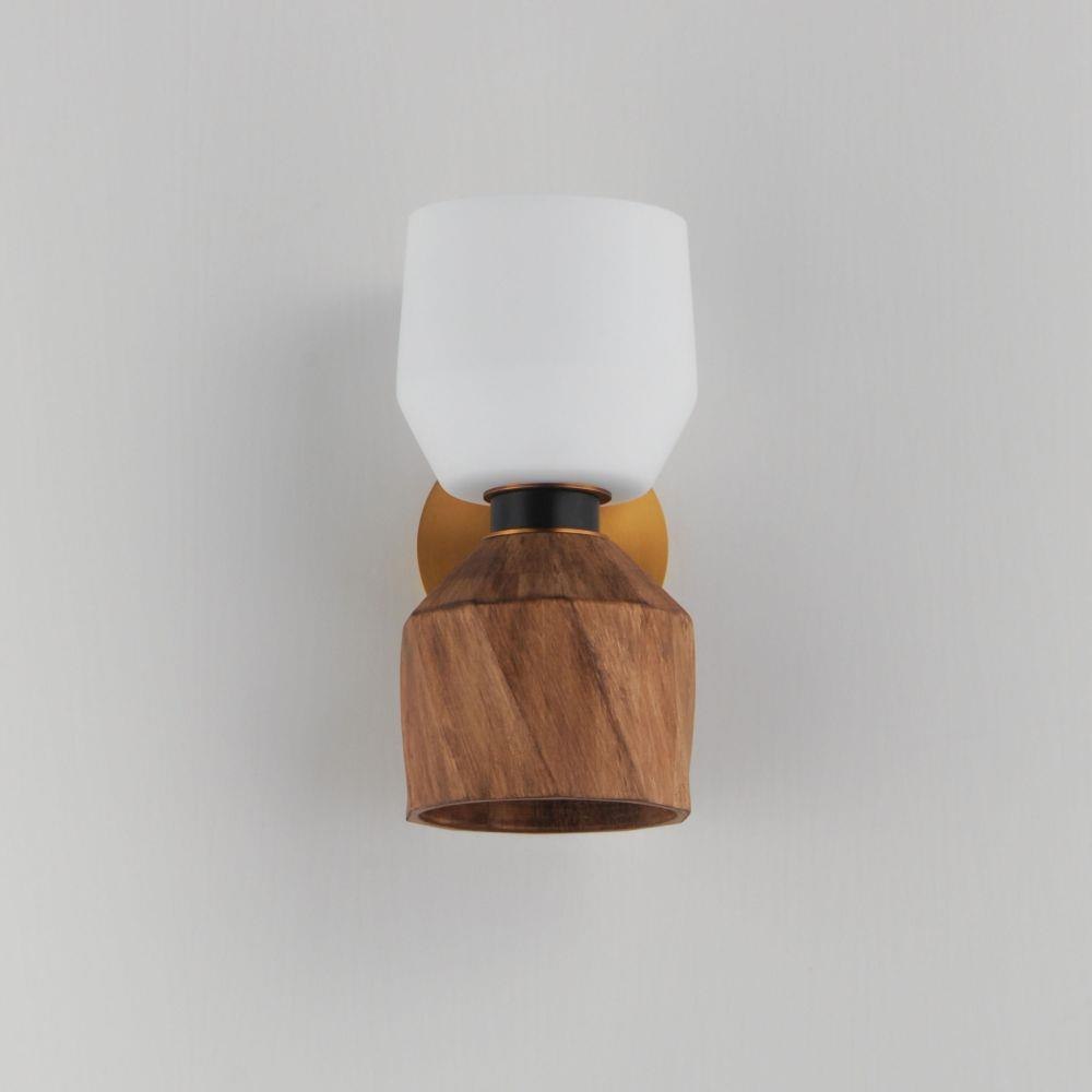 This stylish modern chandelier combines solid wood shades with warm bronze and brass tones for a striking, transitional look. Featuring arms akimbo, the design pairs walnut-stained oak with Satin White glass shades, offering a sophisticated blend of materials and providing glare-free, ambient lighting. A coordinating swing-arm wall sconce extends horizontally with a sturdy, attractive arm structure. A simpler two light wall sconce also pairs well with the collection. Finished in a two-tone Dark Bronze and Antique Brass, and complemented by the natural wood tones, this collection easily blends with a variety of styles. LED lamps are included with each fixture, ensuring energy efficiency and convenience.