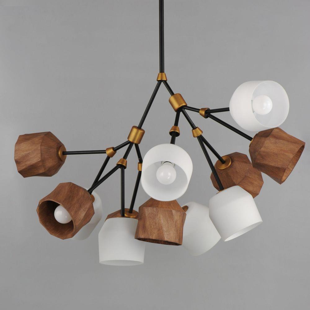 This fashionable modern chandelier combines solid wood shades with warm bronze and brass tones. Posing with arms akimbo, a combination of walnut stained oak and Satin White glass shades creates a transitional statement in mixed materials while also providing pleasant glare-free lighting. A coordinating swing arm wall sconce extends horizontally using an attractive and sturdy arm structure. This collection blends with a variety of styles thanks to its two-tone Dark Bronze and Antique Brass finish and the natural tones of the wooden shades. LED lamps are conveniently included with the fixtures as an all-inclusive package, making them energy efficient as well.