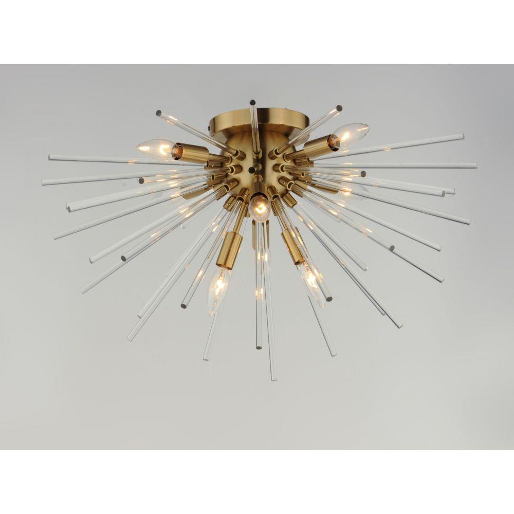 A dazzling burst of Clear glass rods extend from a classic sputnik shape finished in a bright Polished Chrome or warm Satin Brass. Available in two sizes of pendants and as a ceiling fixture, this unique look is a statement piece designed to attract attention.