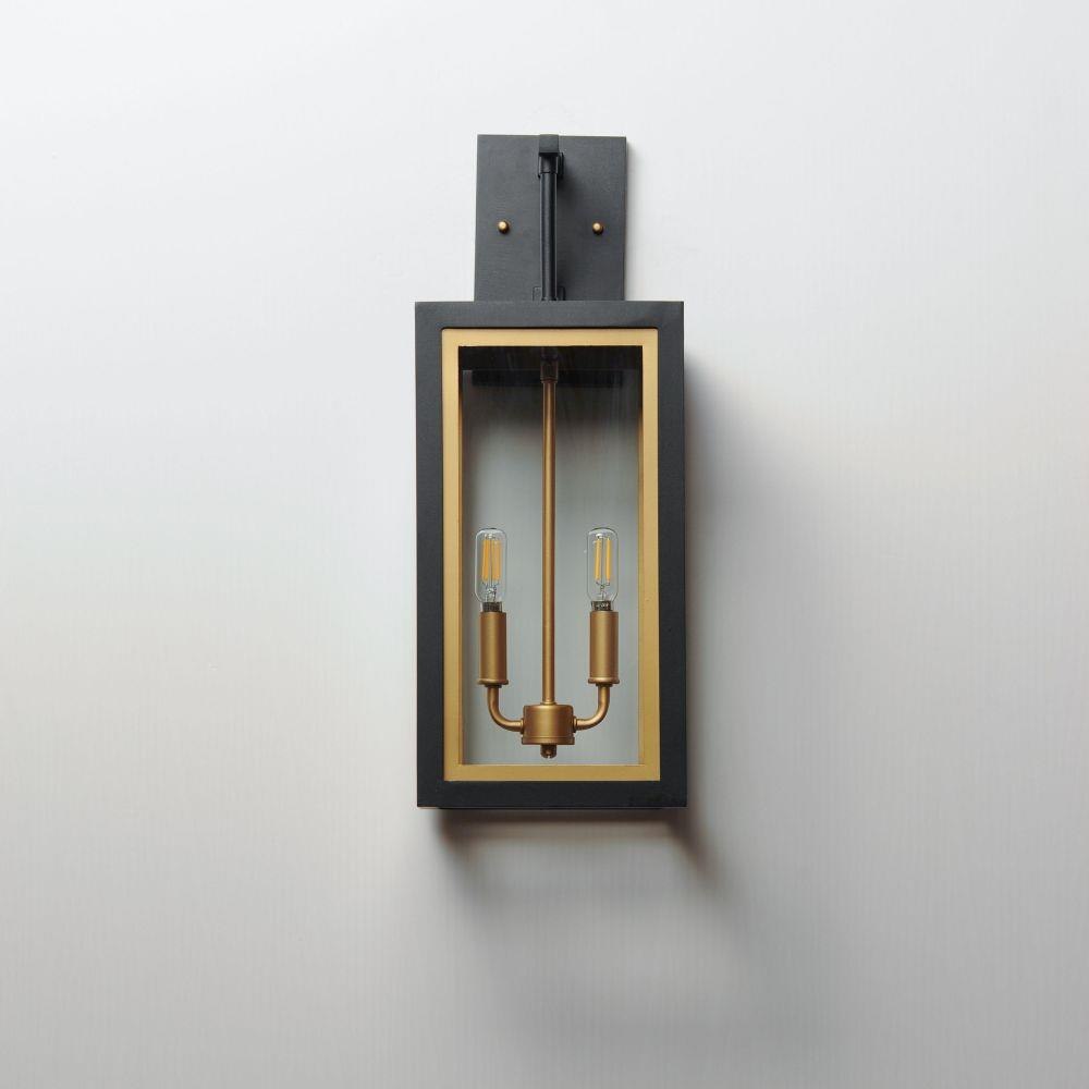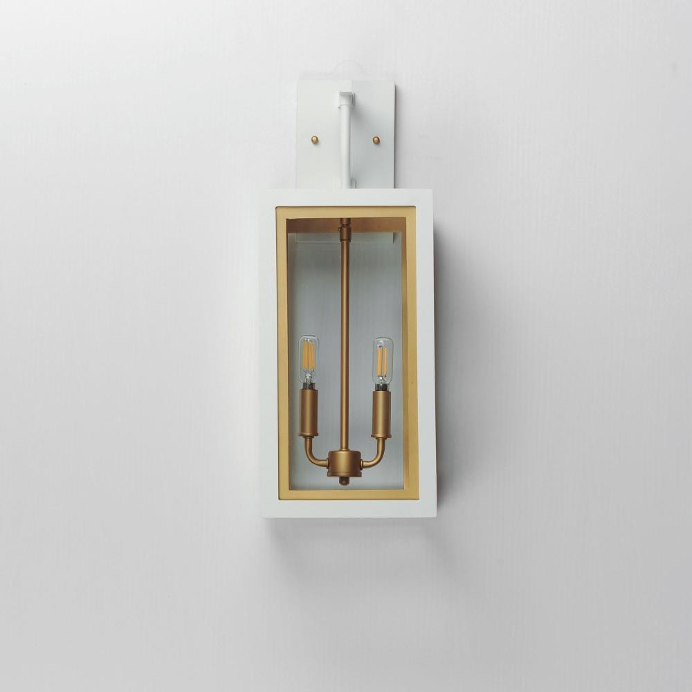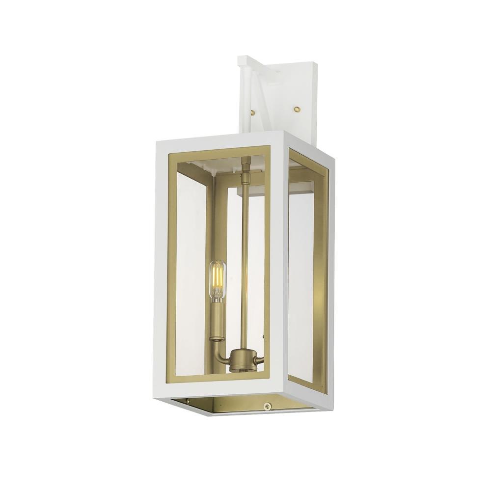 Two-tone frames of Black or White with internal Gold frames provides a neoclassical approach to the squared coach lantern. The sconces jut out from the wall on well-defined trusses that add a contemporary element. Delivering a classic design that suits most exteriors, this collection adds interest in the interior contrasting frame of Gold that secures clear glass panes to diffuse the lamp within.