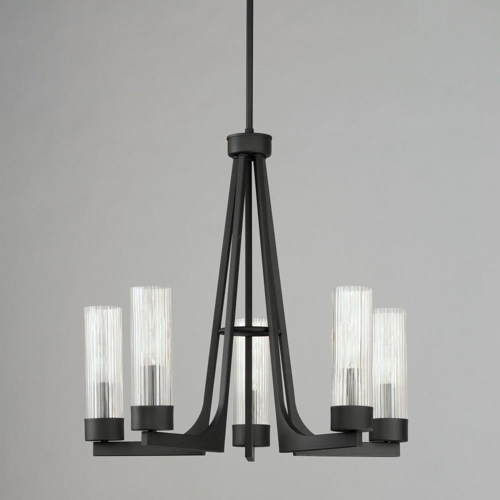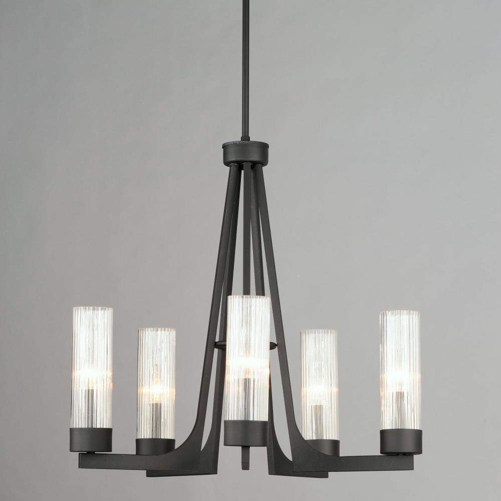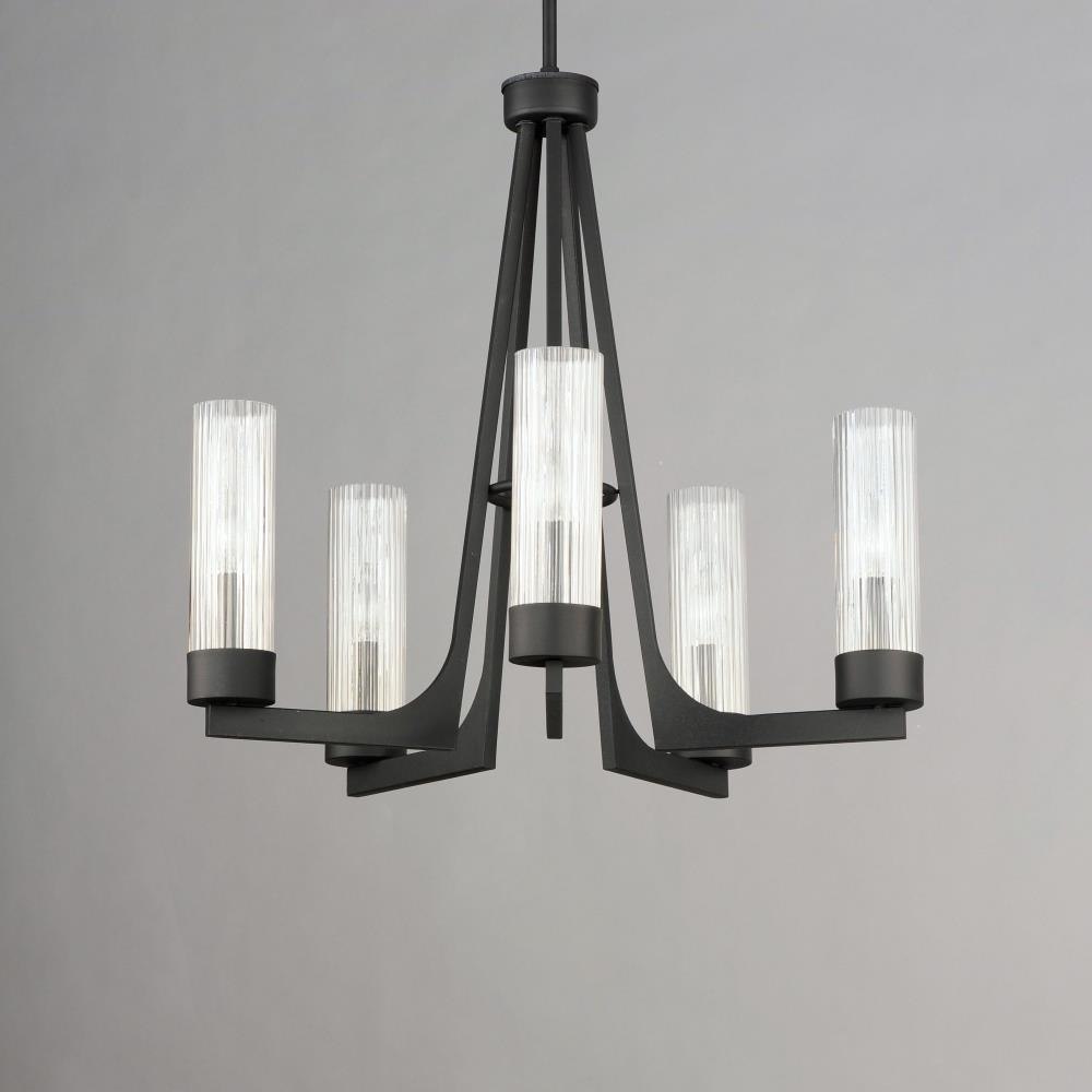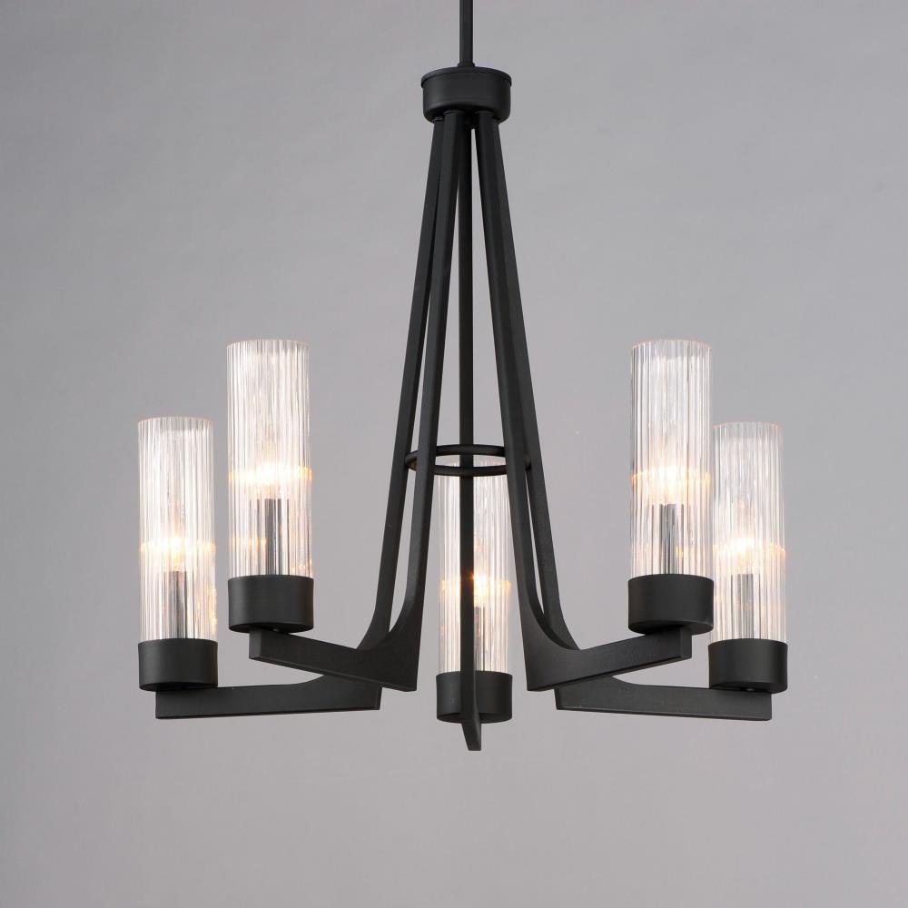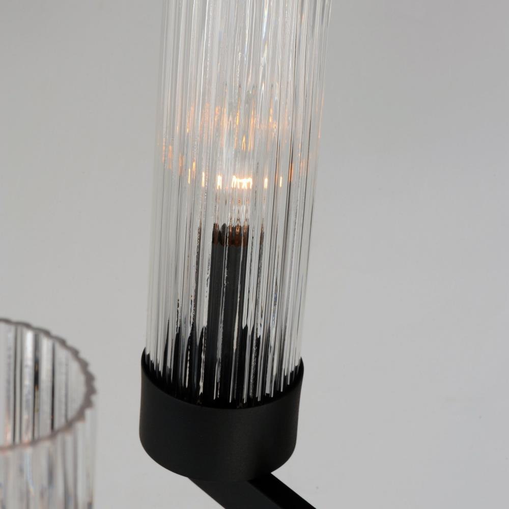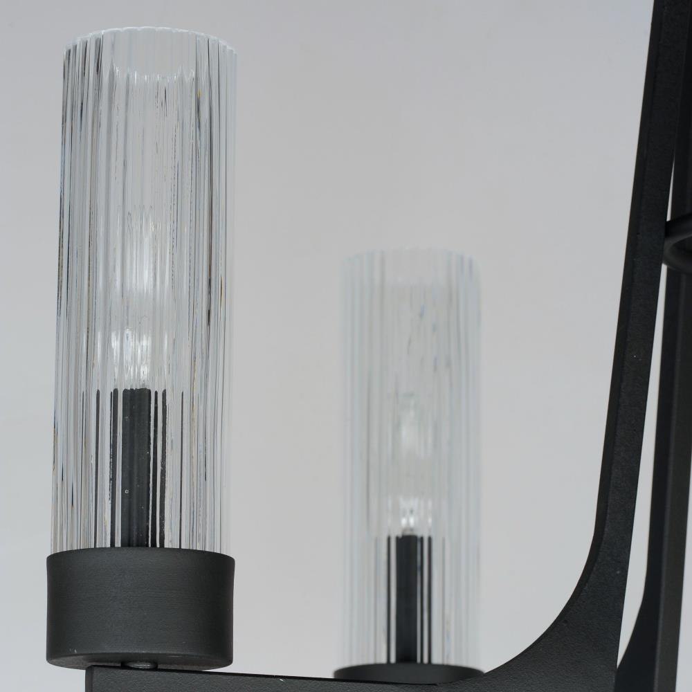 Evocative of the past and modernized for today, the Delos collection features ironwork finished in a textured Anthracite that support hefty glass columns. The glass shades are elongated to accentuate the verticality of the chandelier and the fluted glass shades diffuse the light in an interesting and subtly romantic way, giving the appearance of candlelight.