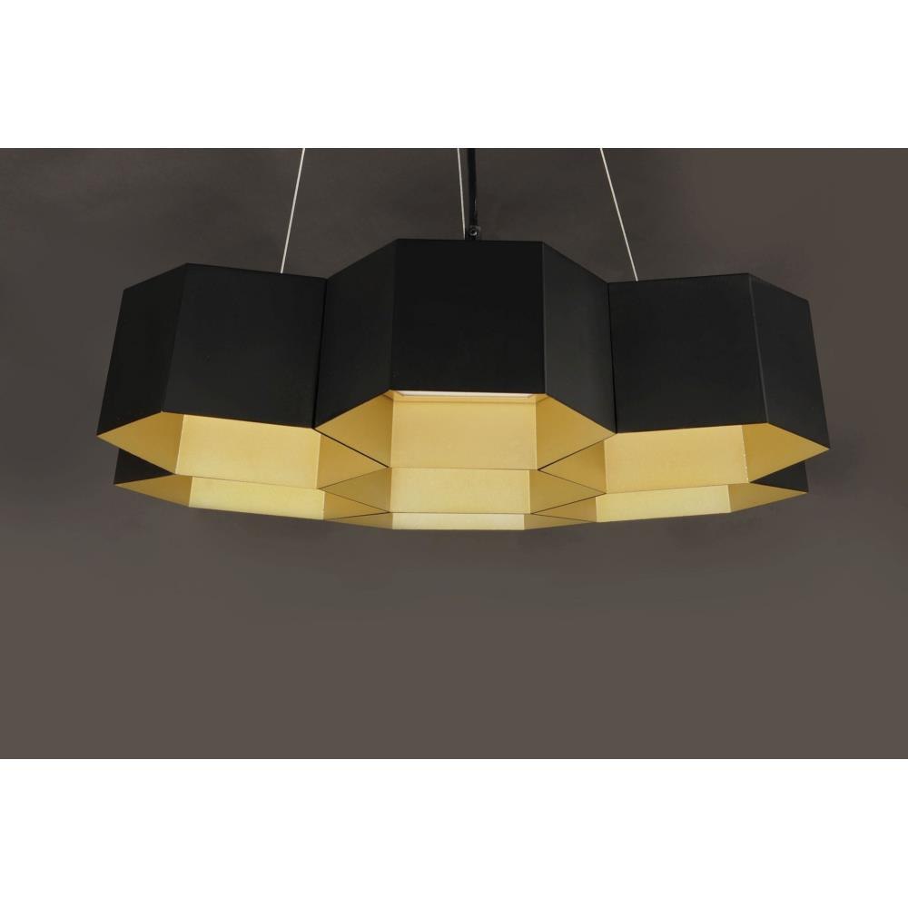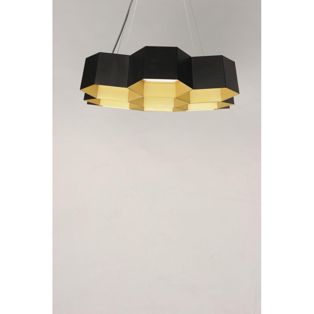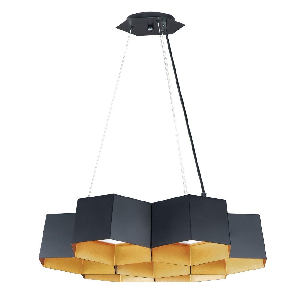 A series of hexagonal metal shades are slightly tapered to create a gentle arc when suspended together. The dramatic combination of Black with Gold interior adds flair to this unique and bold design. Ample illumination is provided by high power integrated LED and softened by acrylic diffusers recessed into each compartment.