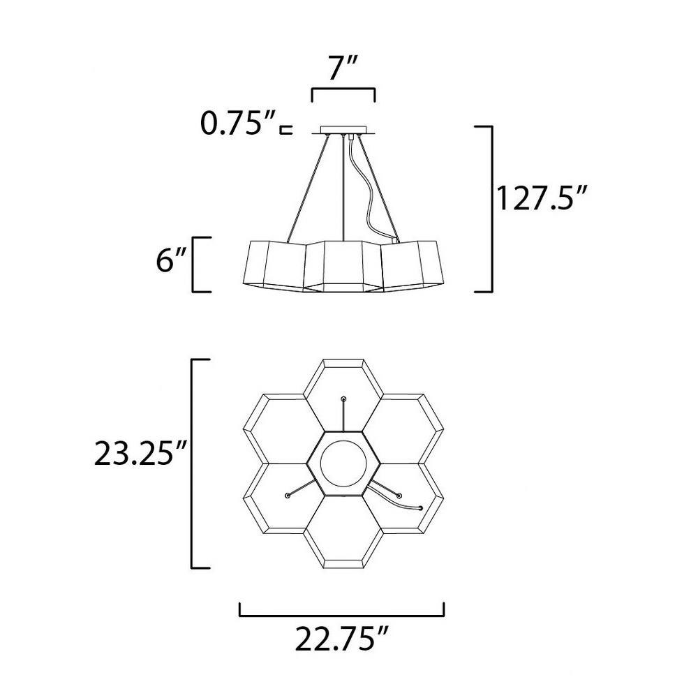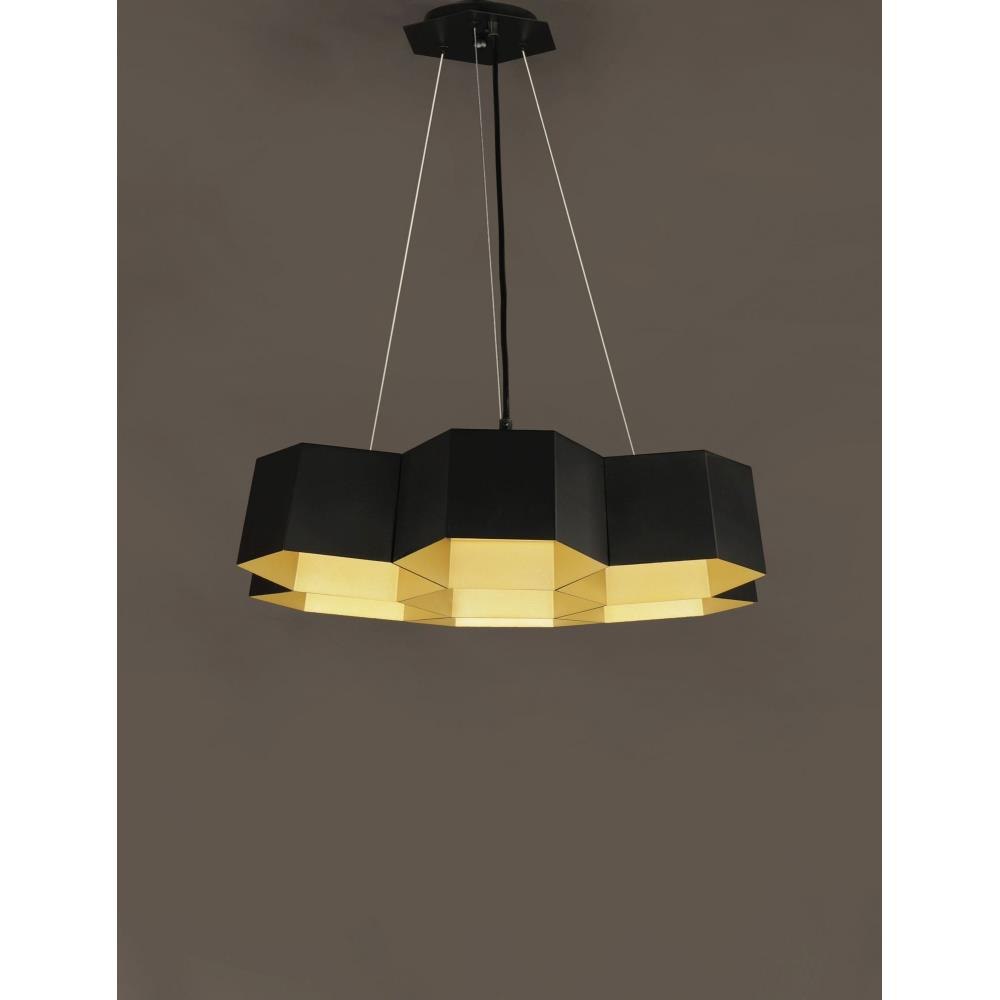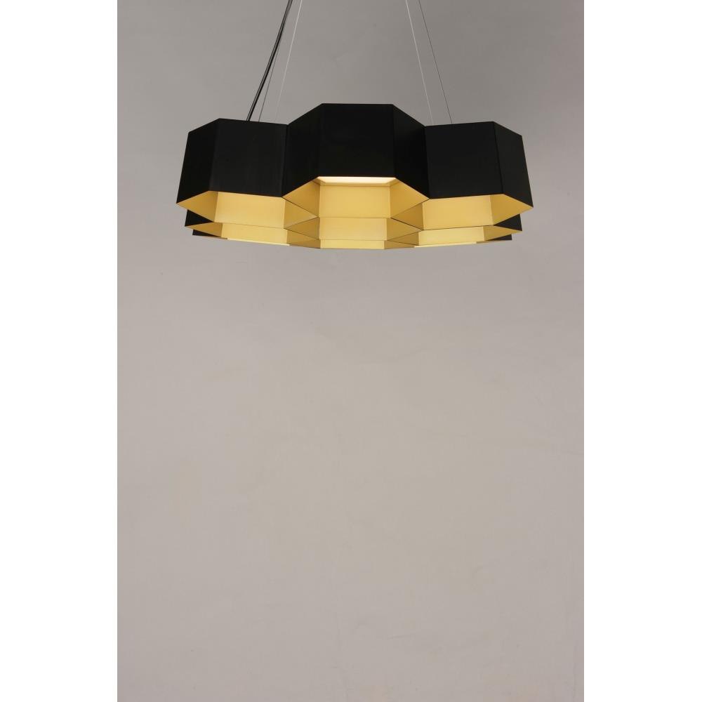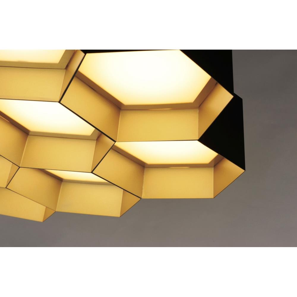 A series of hexagonal metal shades are slightly tapered to create a gentle arc when suspended together. The dramatic combination of Black with Gold interior adds flair to this unique and bold design. Ample illumination is provided by high power integrated LED and softened by acrylic diffusers recessed into each compartment.