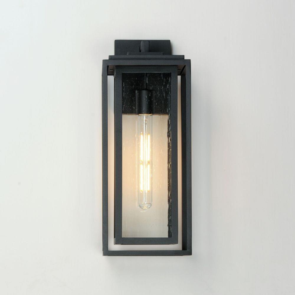 A dual framed structure creates dimension on these outdoor lighting fixtures that is both contemporary and transitional. The construction consists of two frames of square tubing and squared components. The inner frame's Clear Seedy glass reduces glare from the light and appears dirt-free for longer periods. This is a comprehensive collection to brighten all areas of your outdoor space, available in various sized sconces as well as hanging and post configurations.