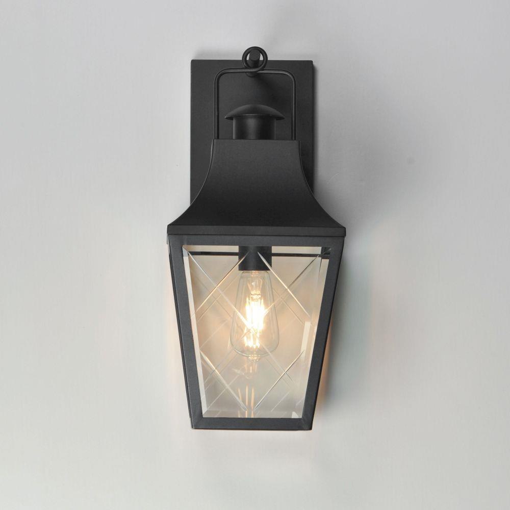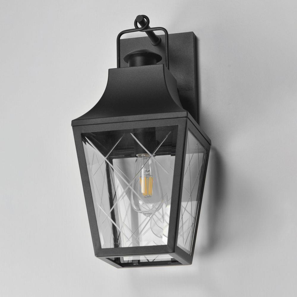 These charming cottage style lanterns feature unique cross-etched glass panels that are Clear and beveled along their edges. Additional design details such as whimsical loops above a chimney element add to the product's delightful appearance. Finished in a Matte Black outdoor rated powder coat, this collection recaptures the appeal of storybook lanterns.