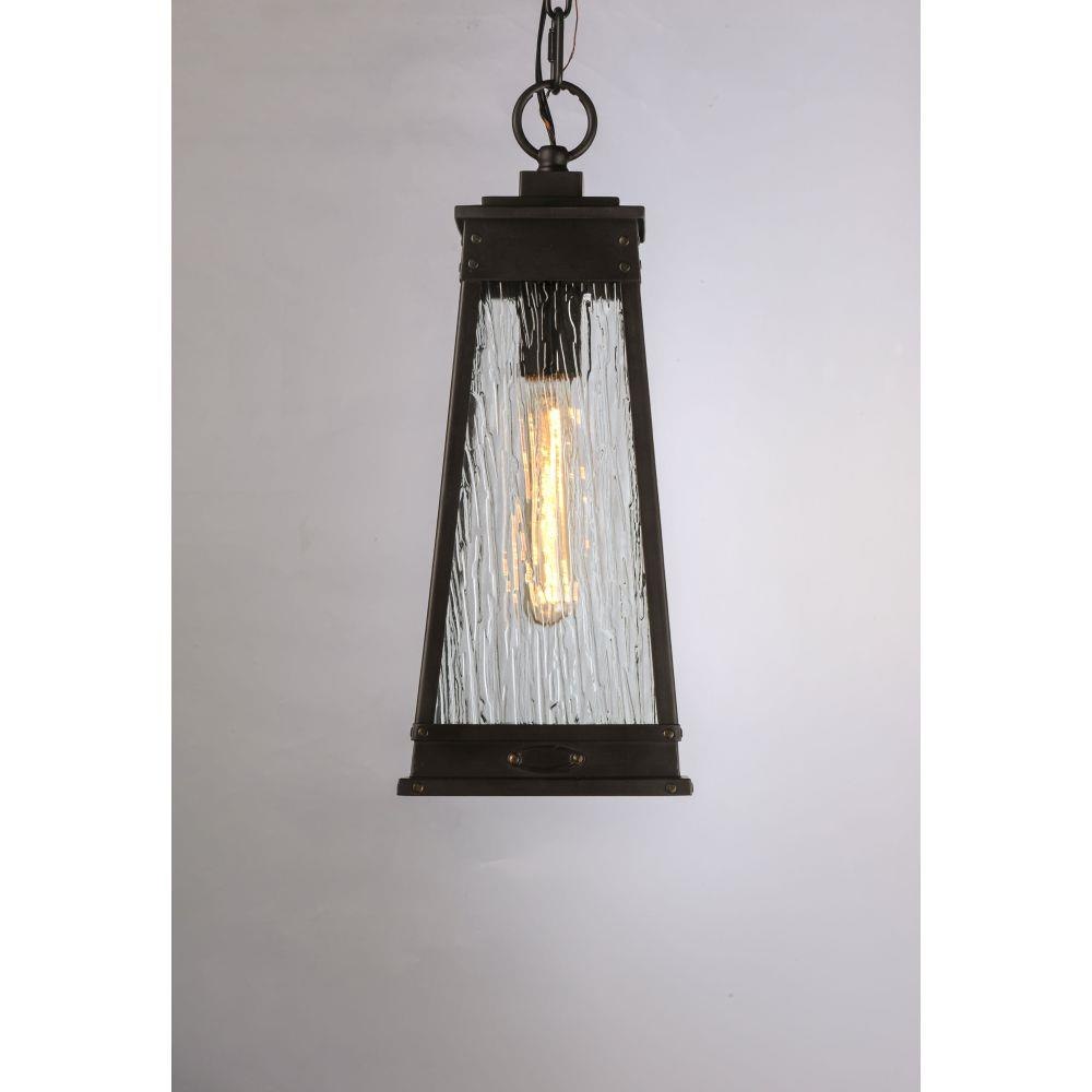 A tapered square shade finished in Olde Brass suspends from a bracket to replicate a nautical lantern. Panels of clear Ripple glass allow for the lamp to shine through while still diffusing the light. The medallion at the base of the shade and rivets along the frame are finished in an antique brass to add authenticity to the design.