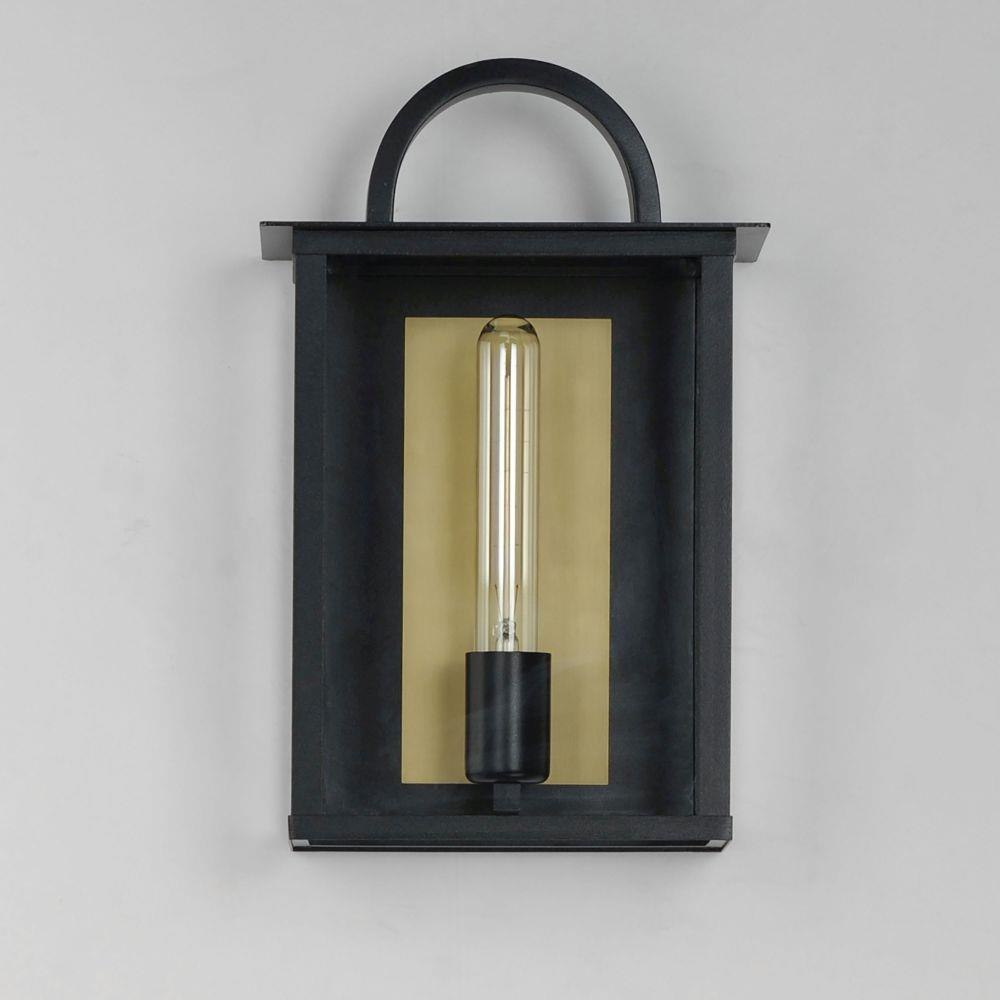The Manchester series is inspired by classic coach lanterns and consists of minimally extended sconces in a variety of sizes that have been modified with simplified embellishments. The black frames have been modified with a squared arc handle and a contrasting Burnished Gold plate that reflects clusters of candle lights surrounded by Clear glass panels. This collection references historic exterior sconces while modernizing their appearance. Complement the design with tubular lamps to accentuate the verticality of the frames.