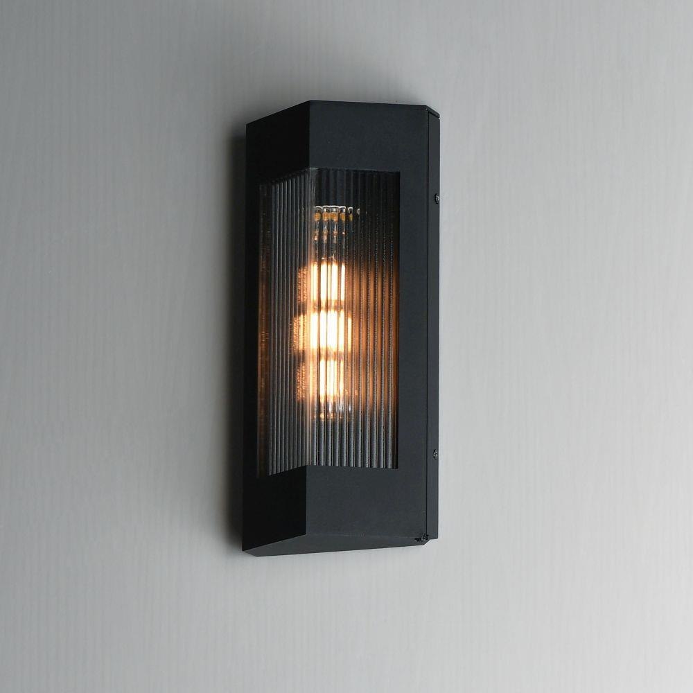 A transitional design suitable for both modern and more traditional applications, this outdoor series of lighting features Clear Ribbed glass that refracts the light source within triangular frames. A Black frame with warm Antique Brass light clusters within, the collection includes 3 sizes of wall sconces and 2 sizes of outdoor rated pendants. With a depth of less than 4 inches, this ADA compliant sconce may also be used in commercial applications.