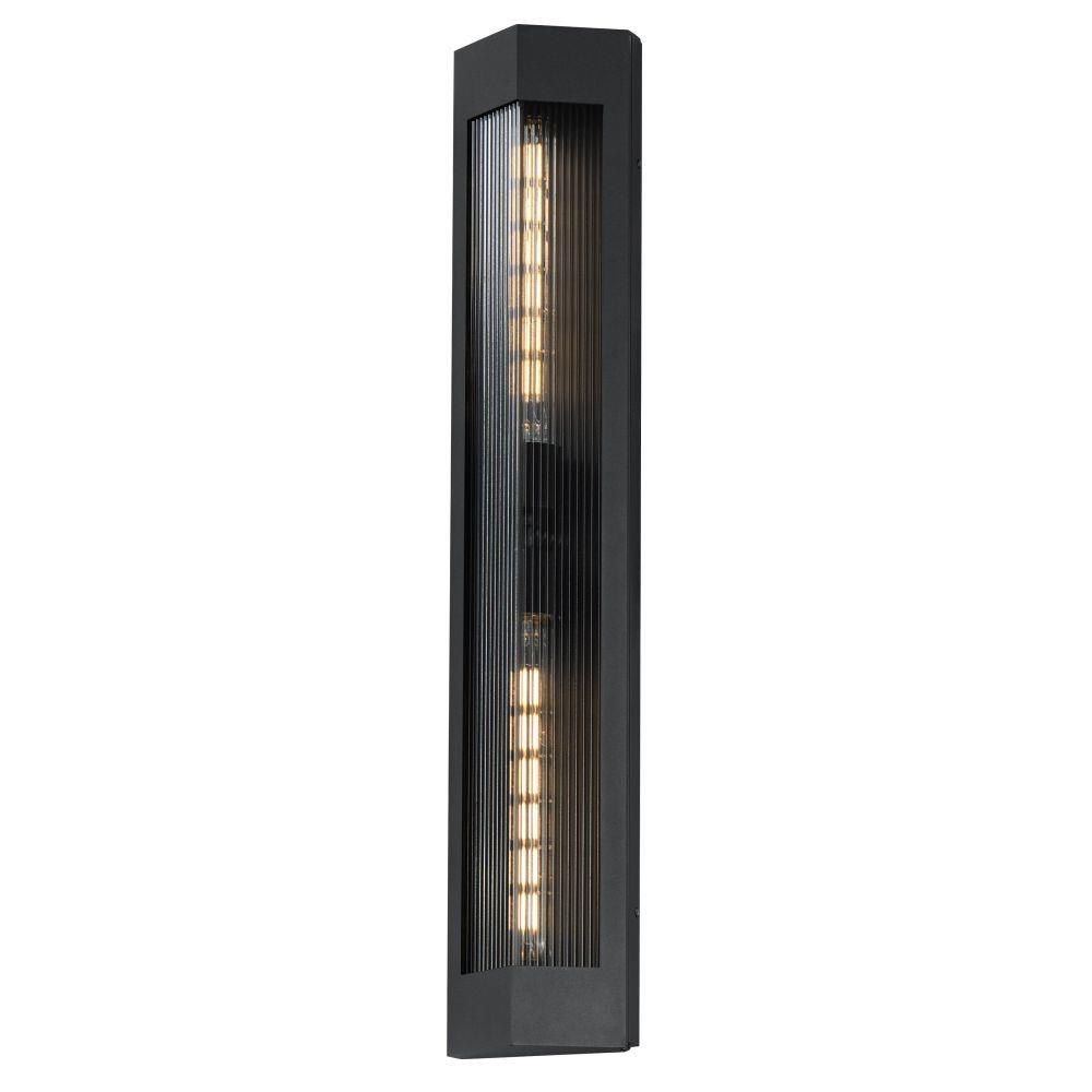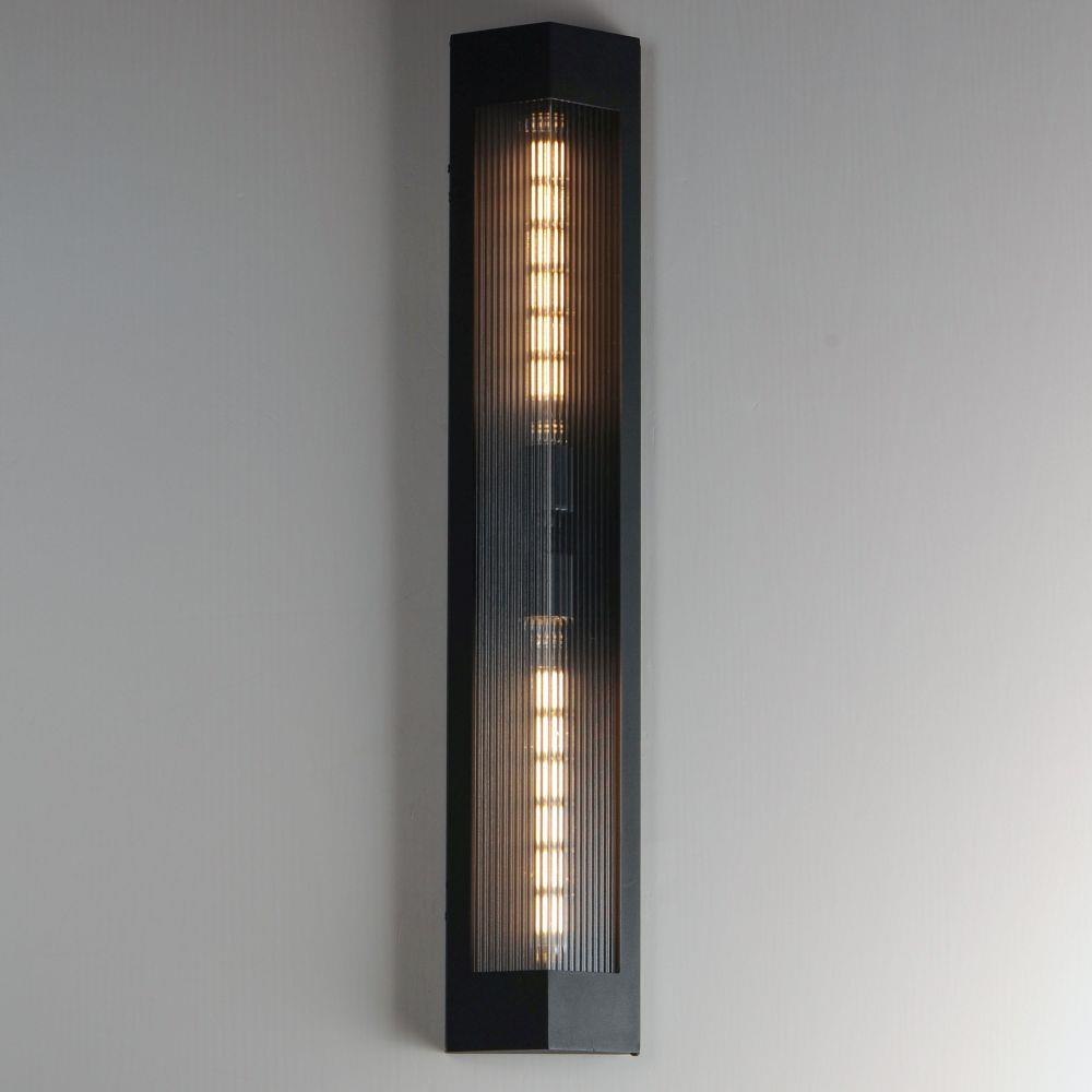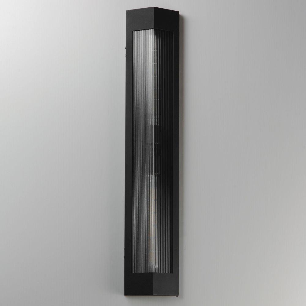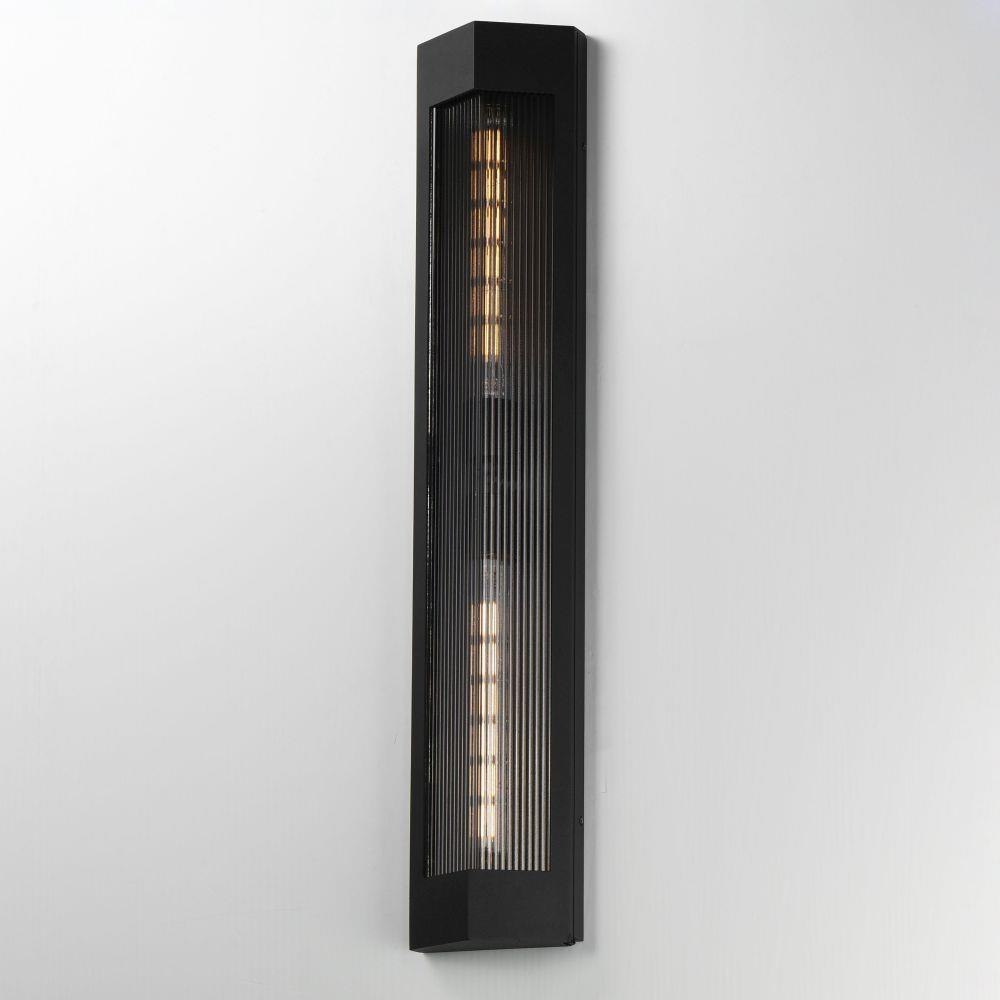 A transitional design suitable for both modern and more traditional applications, this outdoor series of lighting features Clear Ribbed glass that refracts the light source within triangular frames. A Black frame with warm Antique Brass light clusters within, the collection includes 3 sizes of wall sconces and 2 sizes of outdoor rated pendants. With a depth of less than 4 inches, this ADA compliant sconce may also be used in commercial applications.