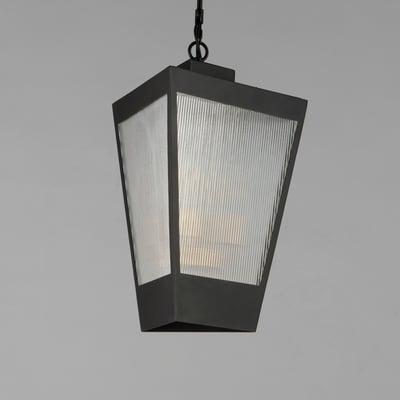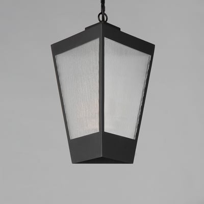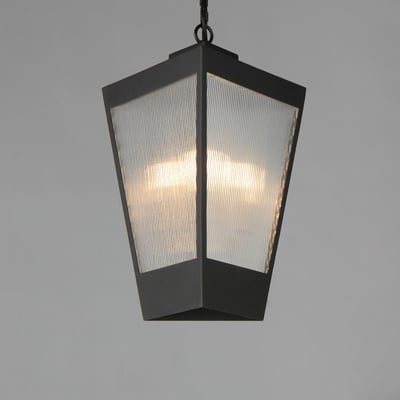 The Triform Outdoor Pendant seamlessly blends modern and traditional styles, enhancing outdoor spaces with its elegant design. Featuring clear ribbed glass within triangular frames, this pendant showcases a striking black frame complemented by warm antique brass light clusters.