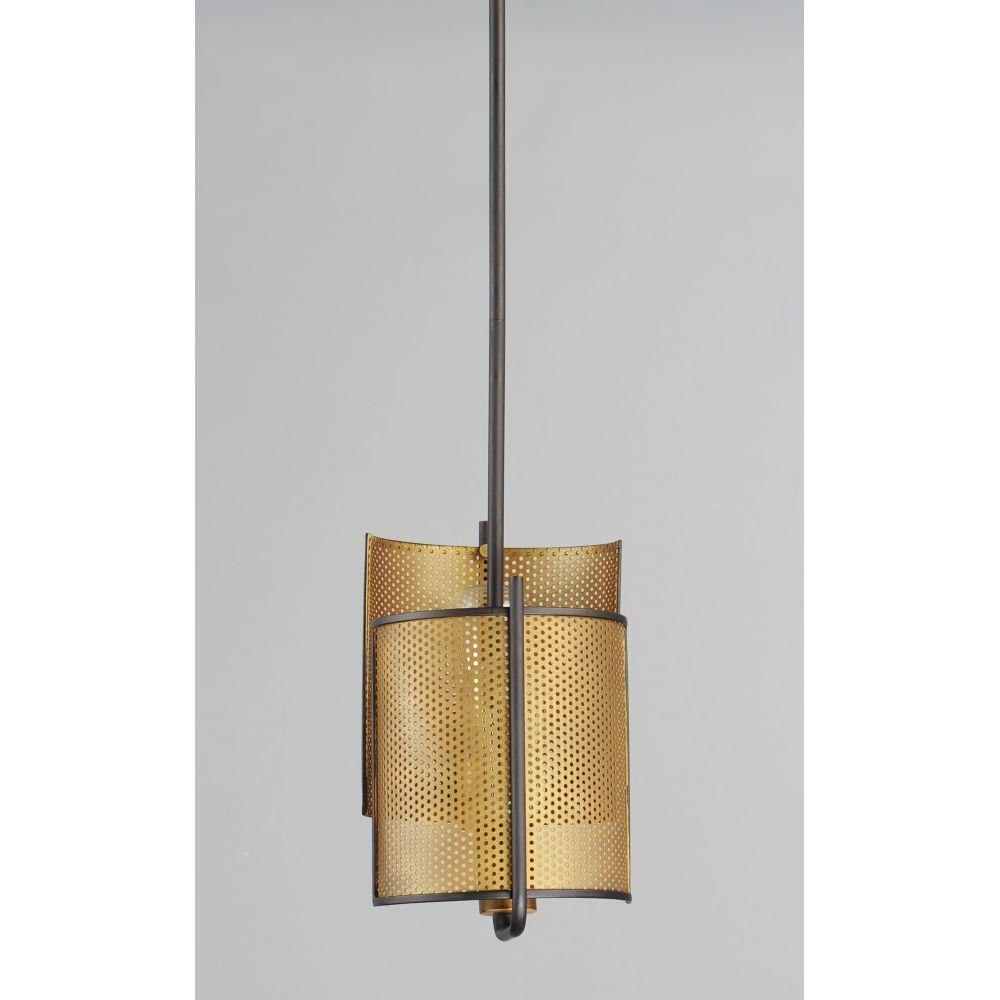 Inner shades of perforated metal are finished in a soft Antique Brass and accented by bands in a complimentary Oil Rubbed Bronze. The light from inside peeks through the perforations and creates an interesting lighting effect. The large scale of the pendants are well suited for larger rooms and hospitality applications.