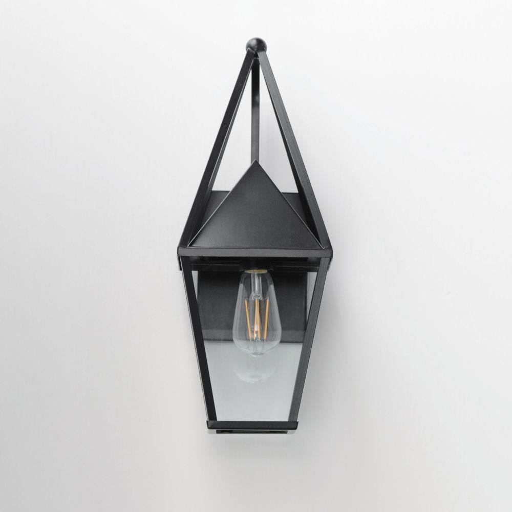 An exaggerated openwork framed steeple adds vertical qualities on a sharp-lined Matte Black lantern frame. Blending modern concepts with forms that evoke a whimsical imagery, this collection presents a transitional styling for outdoor spaces.
