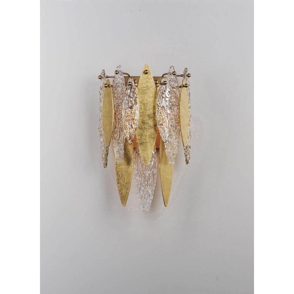 Hand-formed glass petals of Clear and Champagne-tint suspend from a tiered frame of gold and accented with petals of solid metal finished in Gold Leaf. Numerous candelabra sockets are strategically placed within the fixture to create glimmer and elegance to this majestic collection.