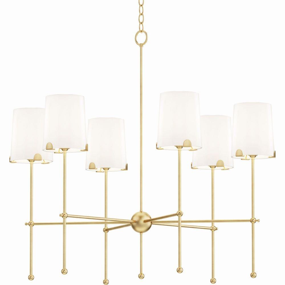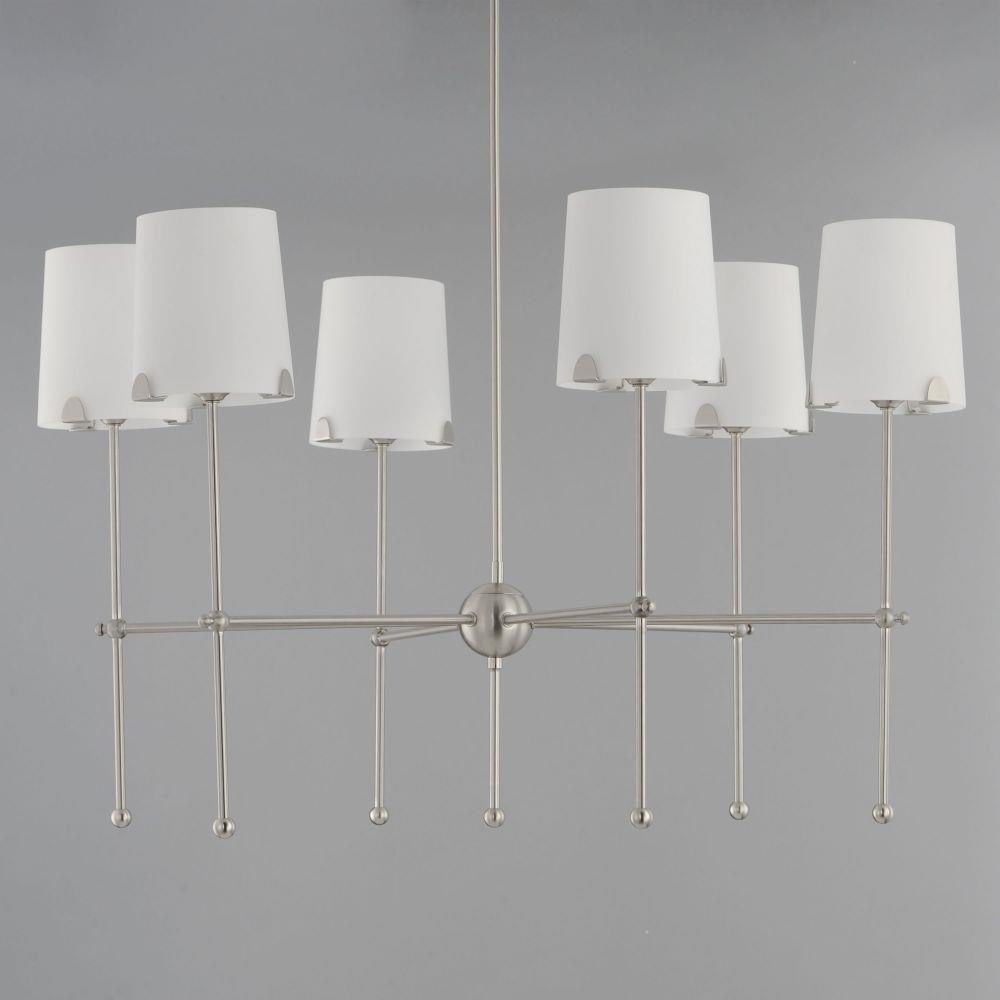 Satin White shades taper in a classic fabric shade shape and rest on elegantly thin frames of Satin Brass or Satin Nickel. They are supported secured by a mostly concealed structure with coordinating semicircular tabs that complement the spherical joints of the frame. The modern design details and updated shade materials refresh the outlook of a timeless chandelier though its use of thoughtful features.