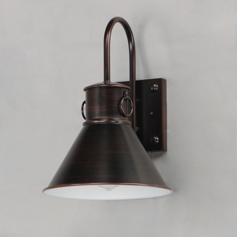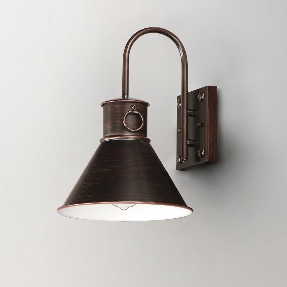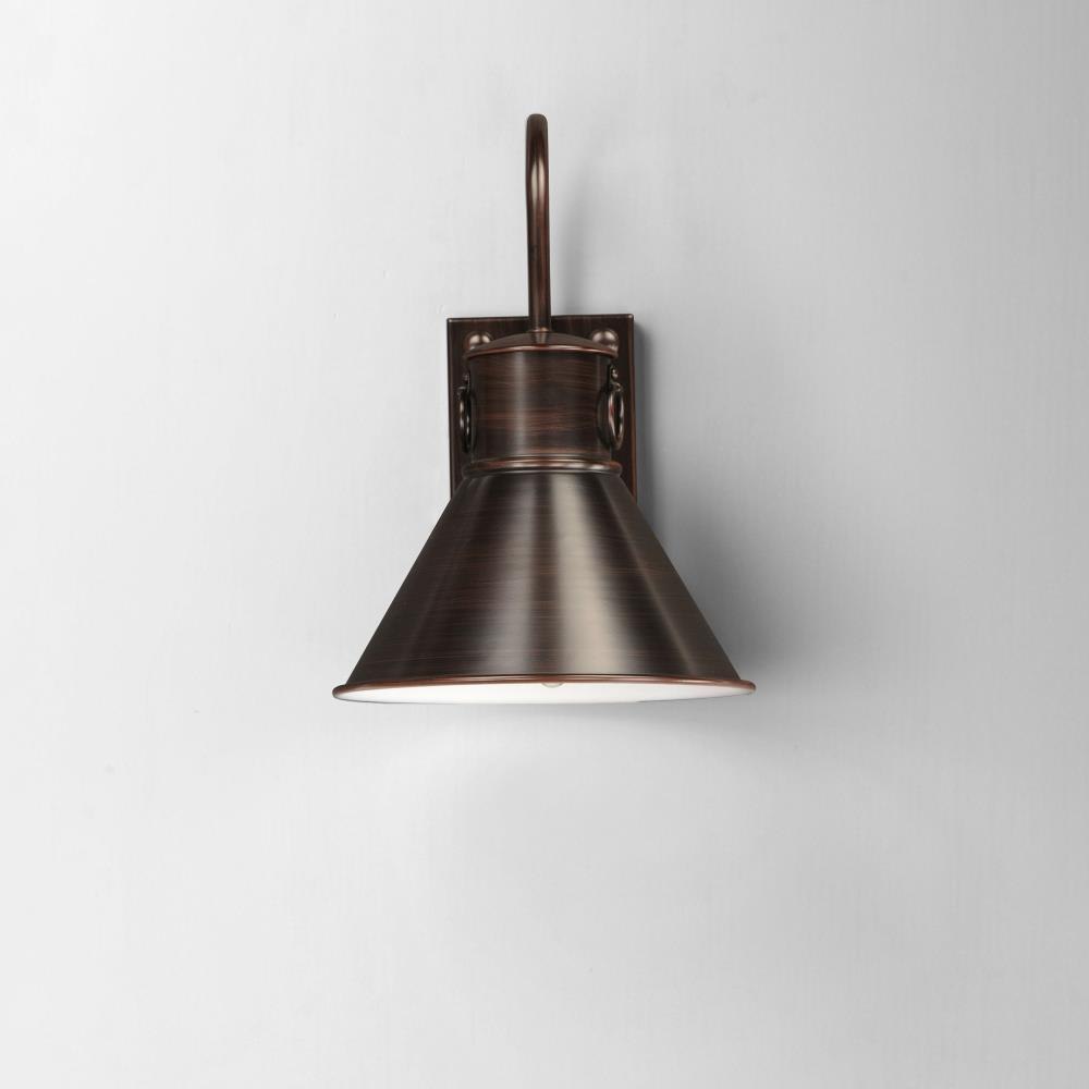 The conical metal shades on these outdoor sconces draw inspiration from the heartland using embellishments such as riveted accents and fastened rings to add rustic charm. The products are finished in a rich Bronze outdoor rated powder coat, and complements similarly styled exterior elements such as honed stone facades and wood siding.