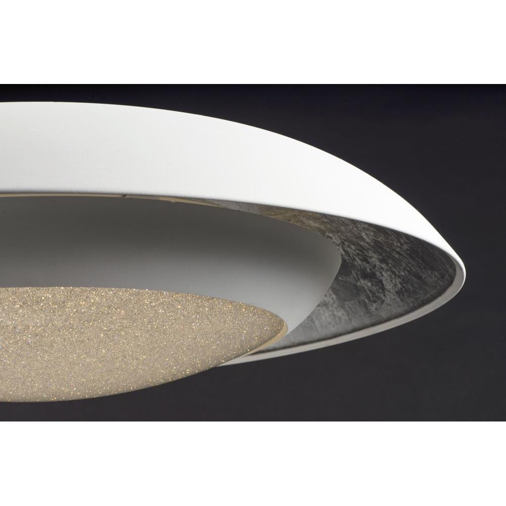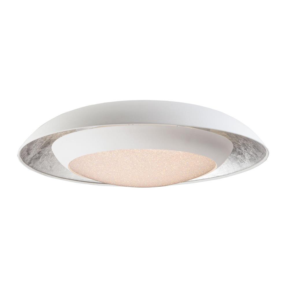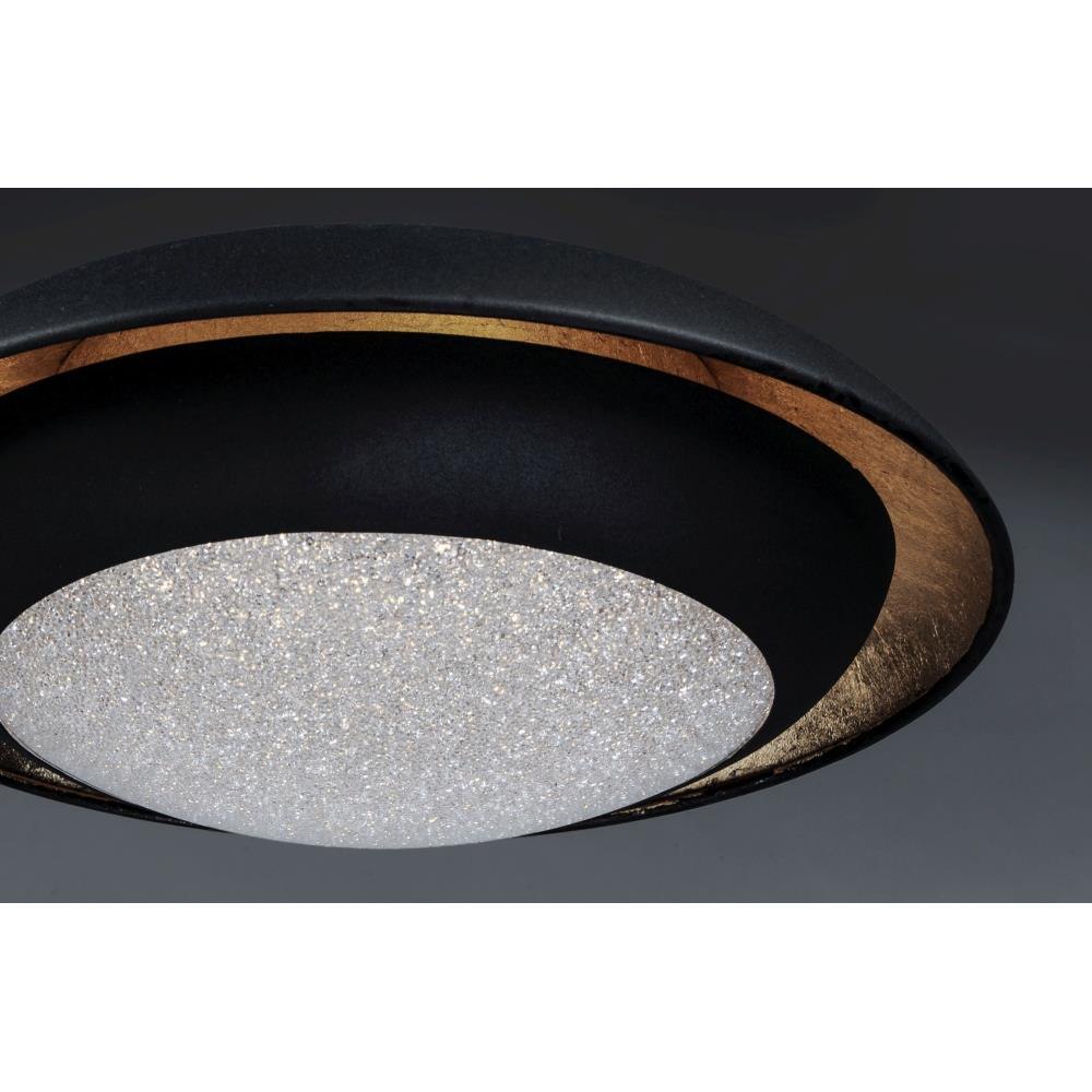 Domes of metal house a circular light engine housing with a Crystaline diffuser. A dramatic lighting effect is created with in-direct light highlighting the foil lining while direct light shines through the sparkling center. Available in your choice of White with Silver Foil or Black with Gold Foil.