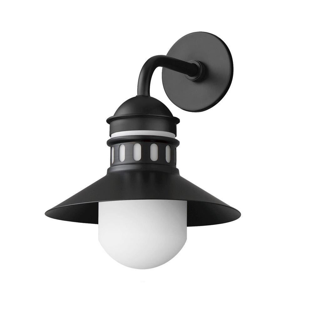 Coastally inspired, the wide brimmed aluminum spun shade on this series of outdoor rated sconces, pendants, and flush mounts features a tiered shade design. The ringed separation features a filigree of oval cut outs, whereby a single lamp illuminates the Satin White glass supporting it. The resulting light is dispersed both above and below the spun shade as well as through the patterned filigree. Both modern and classic homes can appreciate this classic design reimagined. The series is available either in Matte Black or a striking Two-Tone Black with Antique Brass.