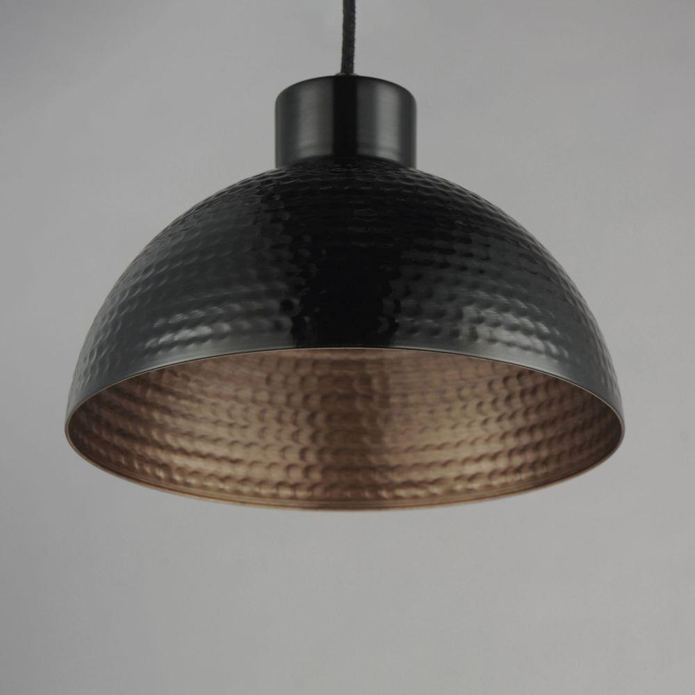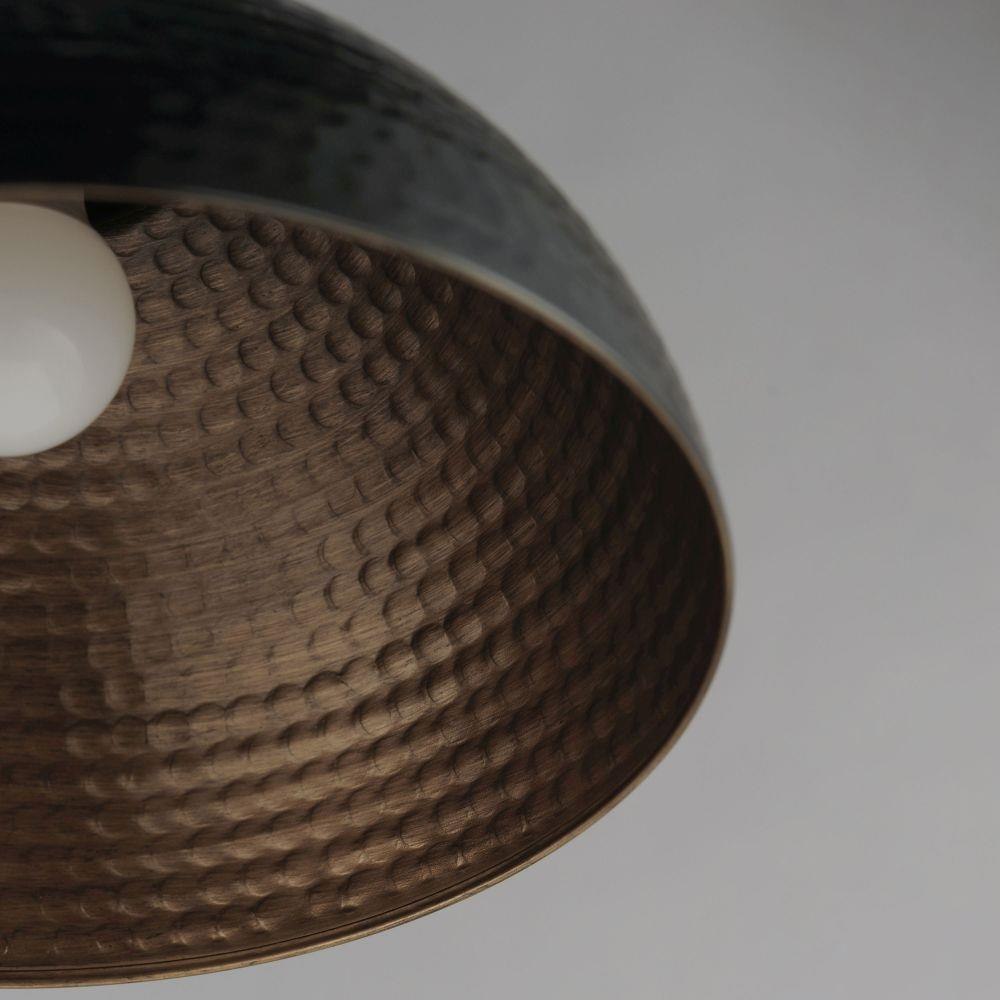 Hammered metal dome shades are painted in glossy enamel paints that welcomes a nautical look. Available in Sage Green with a glossy white interior or Glossy Black with an Antique Copper interior, these pendants embody a nostalgic element that prevails along coastline bungalows and cottages Black Rayon fabric cord adds designer details to the overall construction. Available in ten inch and twelve-inch diameters.